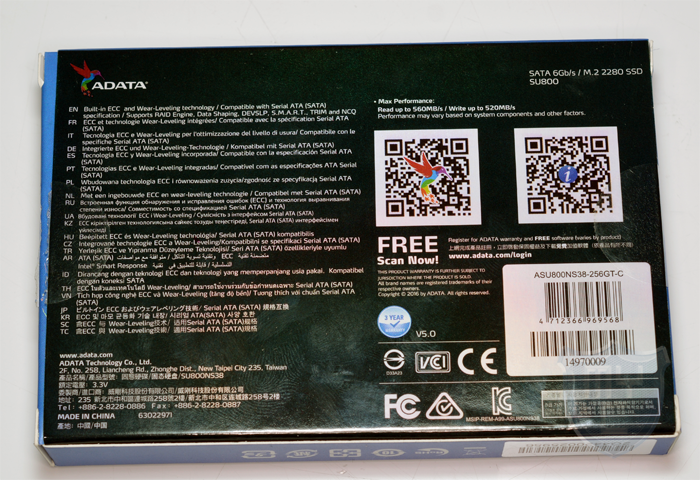 Die Ultimate SU800 M.2 256GB SSD wird von ADATA in einer kleinen Verpackung geliefert, welche in einem glänzenden Design gehalten ist. Auf der Verpackungsvorderseite ist neben einem Produktbild auch die Modellnummer sowie auch die Kapazität abgedruckt.