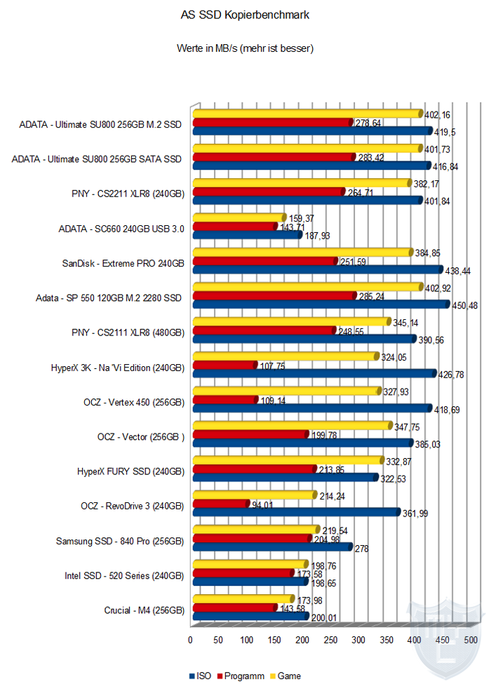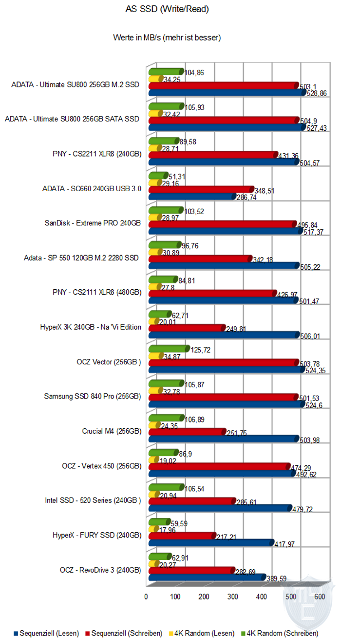 Die von ADATA angegeben 560MB/s beim Lesen konnten wir in unserem Test mittels des AS SSD Benchmarks nicht ganz erreichen. Gleiches gilt auch für die angegeben, maximale Schreibgeschwindigkeit von 520MB/s.