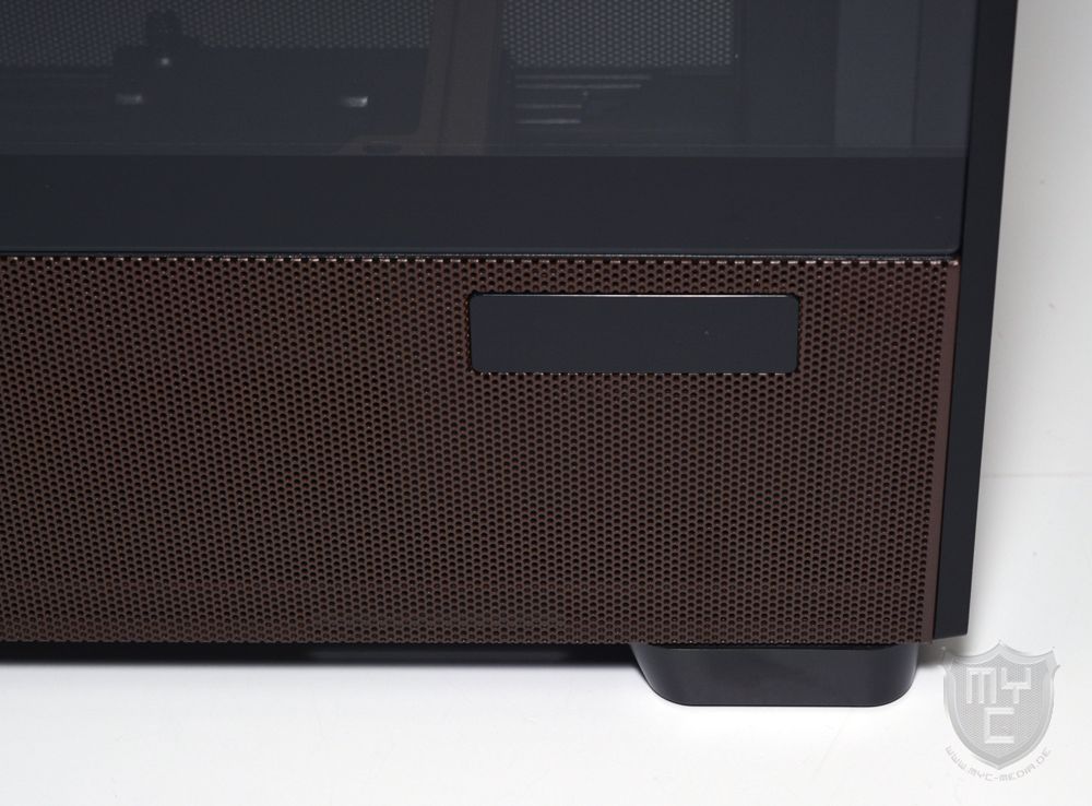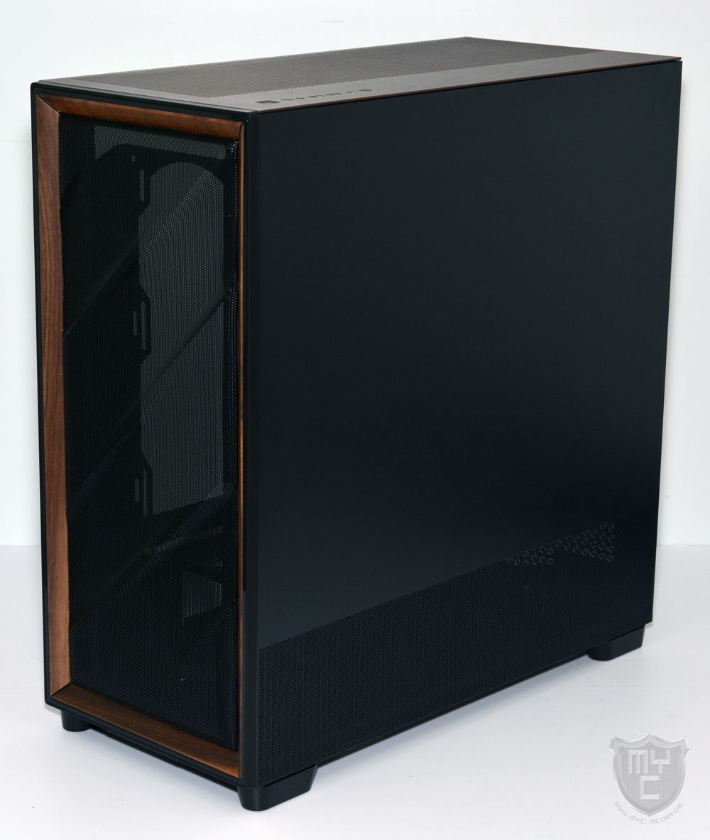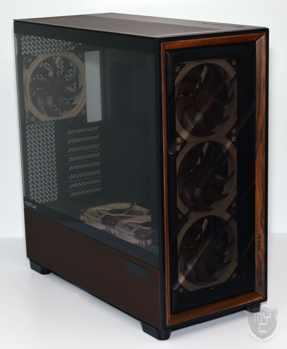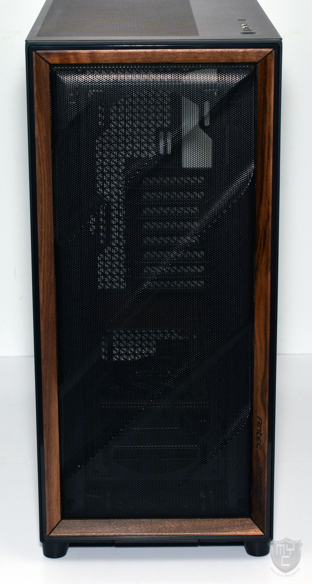 sondern rund um das Mesh-Gitter herum wurde auch der bekannte Streifen aus dunklem Nussbaumholz eingearbeitet. Neben einem eingeprägten und zudem schwarz eingefärbten Antec Logo wurde dieser Holzstreifen in der unteren Rechten Ecke auch mit einem Noctua Logo versehen.