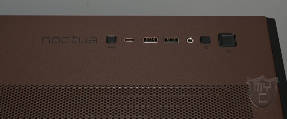 Um das Design der Gehäusefront nicht zu unterbrechen, hat Antec nicht nur auf ein in das Mesh-Gitter eingelassenes Logo verzichtet, sondern auch das I/O-Panel wurde in den vorderen Bereich der Gehäuseoberseite verlegt. Neben dem obligatorischen Power- und Resetschalter sowie einem vierpoligen Audioanschluss hat Antec an dieser Stelle auch zwei USB 3.0 Type-A-Anschlüsse verbaut. Zudem findet man an dieser Stelle auch einen USB 3.2 Type-C-Anschluss vor. Neben diesen Anschlüssen wurde das Gehäuse auch noch mit einem weiteren Schalter für die linke Gehäuseseite integrierte Temperaturanzeige ausgestattet sowie mit einem Noctua Logo bedruckt.