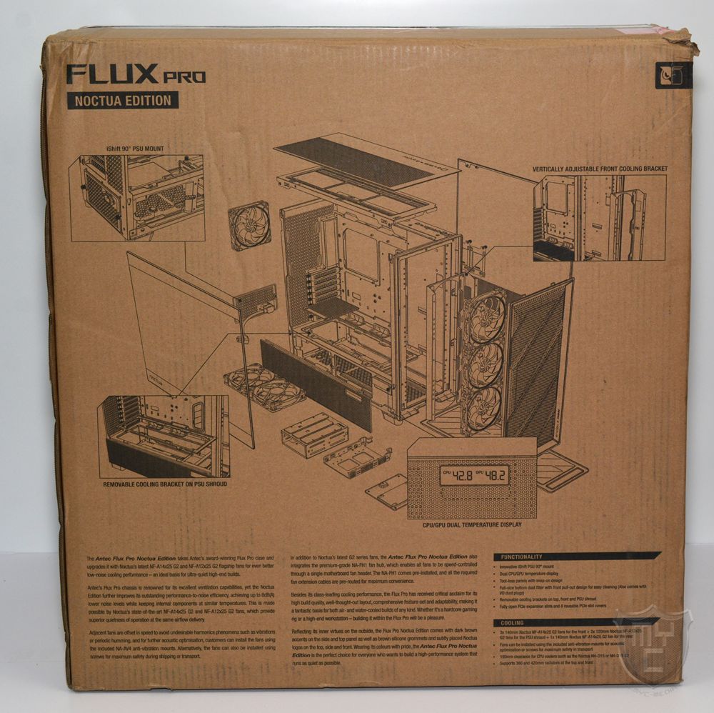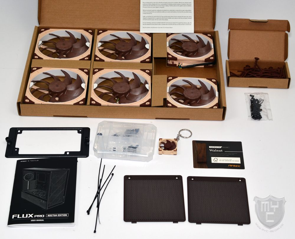 Anders, als man es von der normalen Version des Flux Pro her kennt, wurde das Flux Pro Noctua Edition jedoch nicht mit vorinstallierten Lüftern ausgestattet. Um die seitens Noctua in dieser Version beigefügten Lüfter während des Transports bestmöglich zu schützen, liegen diese in einem separaten Karton bei und müssen durch den Nutzer verbaut werden.