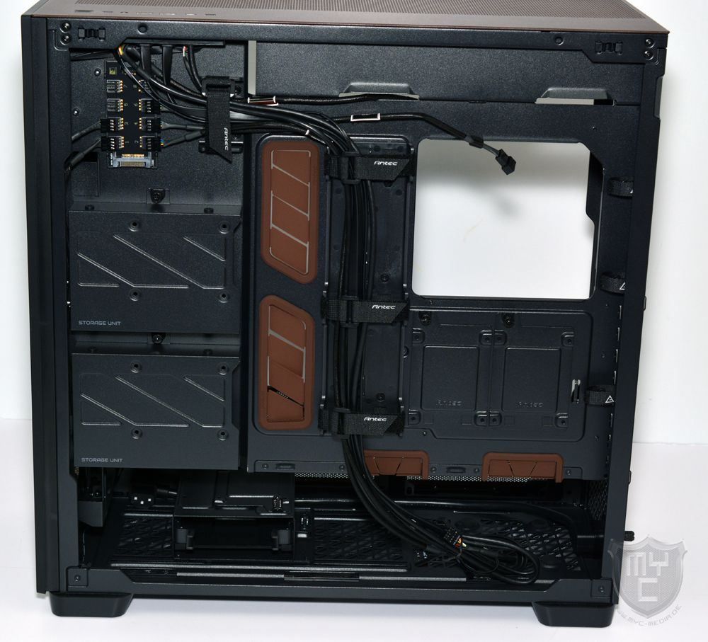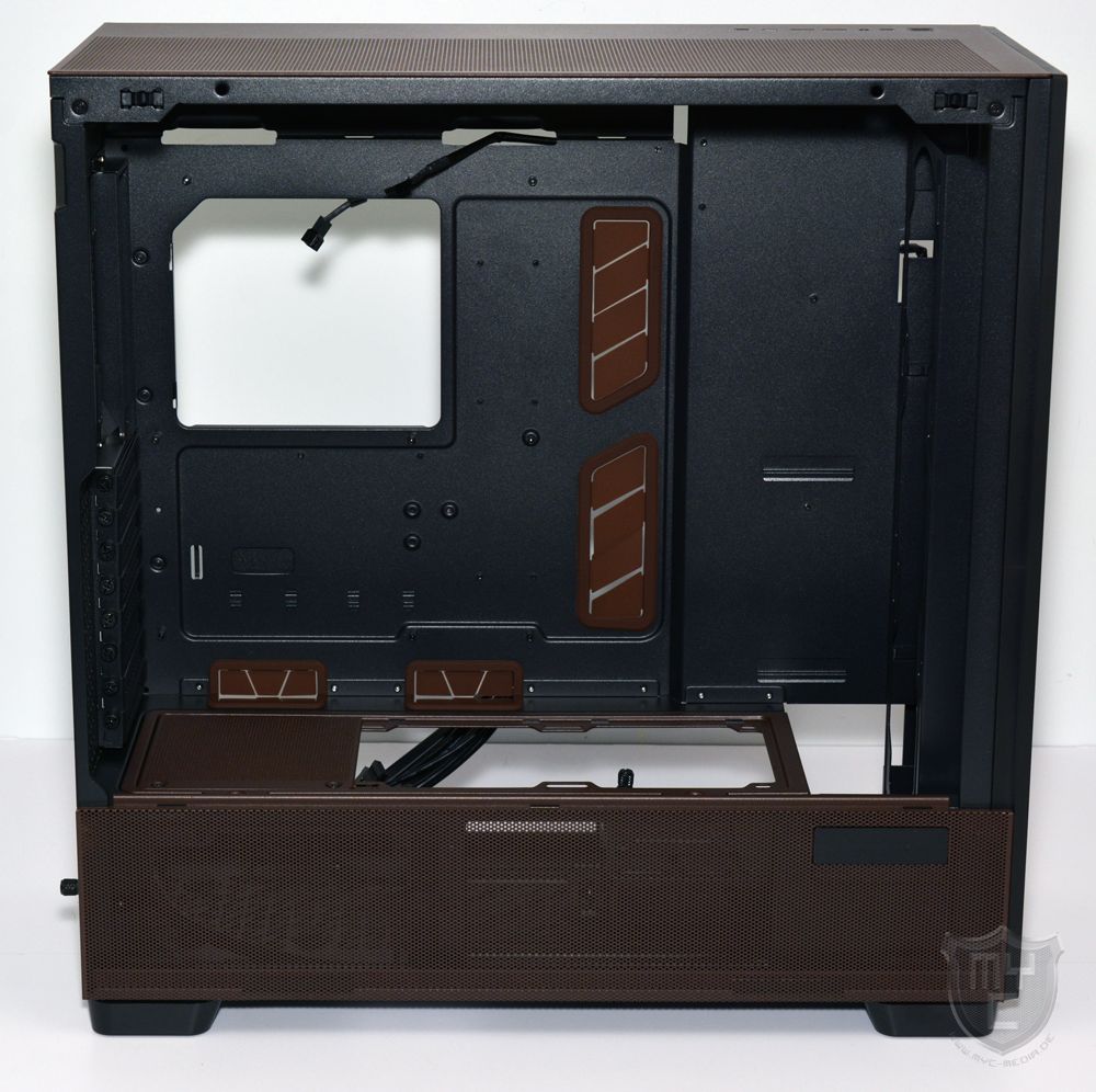 Antec hat dem Flux Pro Noctua Edition einen aufgeräumten Innenraum spendiert, bei welchem man im unteren Bereich einen PSU-Tunnel vorfindet. Im Gegensatz zu vielen anderen Gehäusen, welche über einen solchen PSU-Tunnel verfügen, hat Antec den hier verbauten PSU-Tunnel jedoch nicht nur mit Kabeldurchführungen ausgestattet, sondern auch mit einem Luftdurchlass, welcher sich über die gesamte Länge des Netzteiltunnels erstreckt.