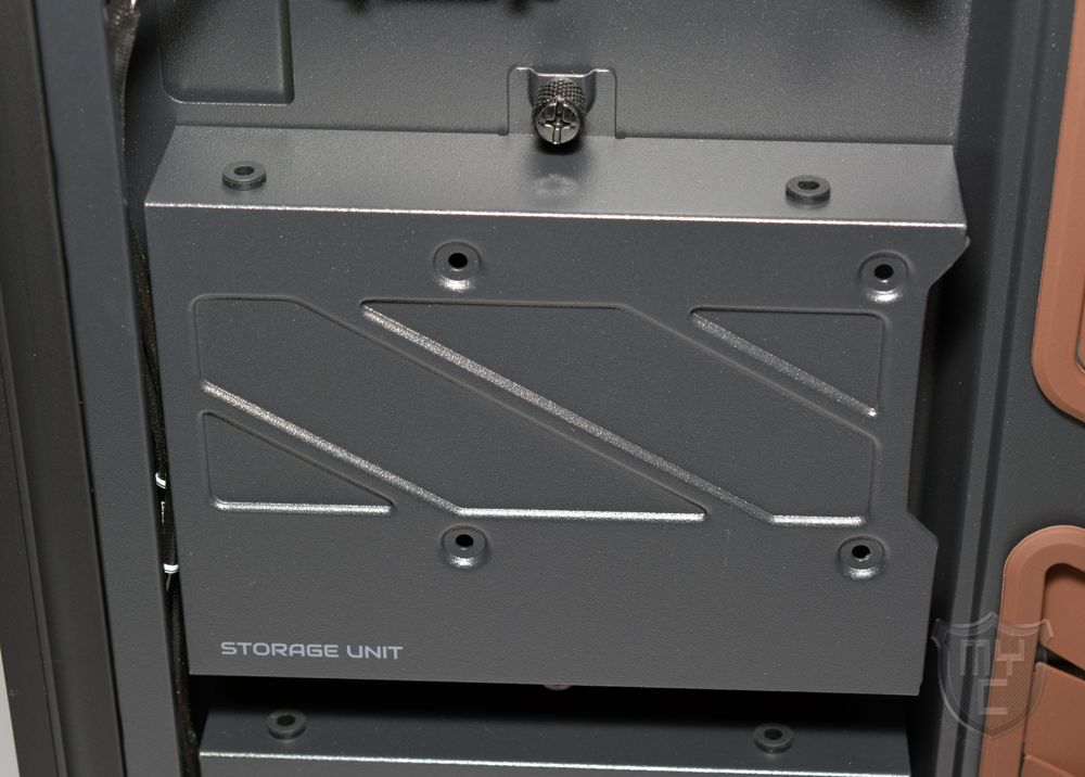 Im modularen Festplattenkäfigen, welcher sich innerhalb des Netzteiltunnels befindet, lässt sich eine 2,5″- sowie eine 3,5″-Festplatte verbauen. Die Montage zwei weiterer 2,5″ oder 3,5″-Festplatten ist direkt hinter der Gehäusefront möglich. Eine werkzeuglose Festplattenmontage ist jedoch nur im Festplattenkäfig möglich, welcher sich im Netzteiltunnel befindet. Dafür bieten die beiden Festplattenkäfige hinter der Gehäusefront die Möglichkeit, 3,5″-Festplatten entkoppelt montieren zu können.