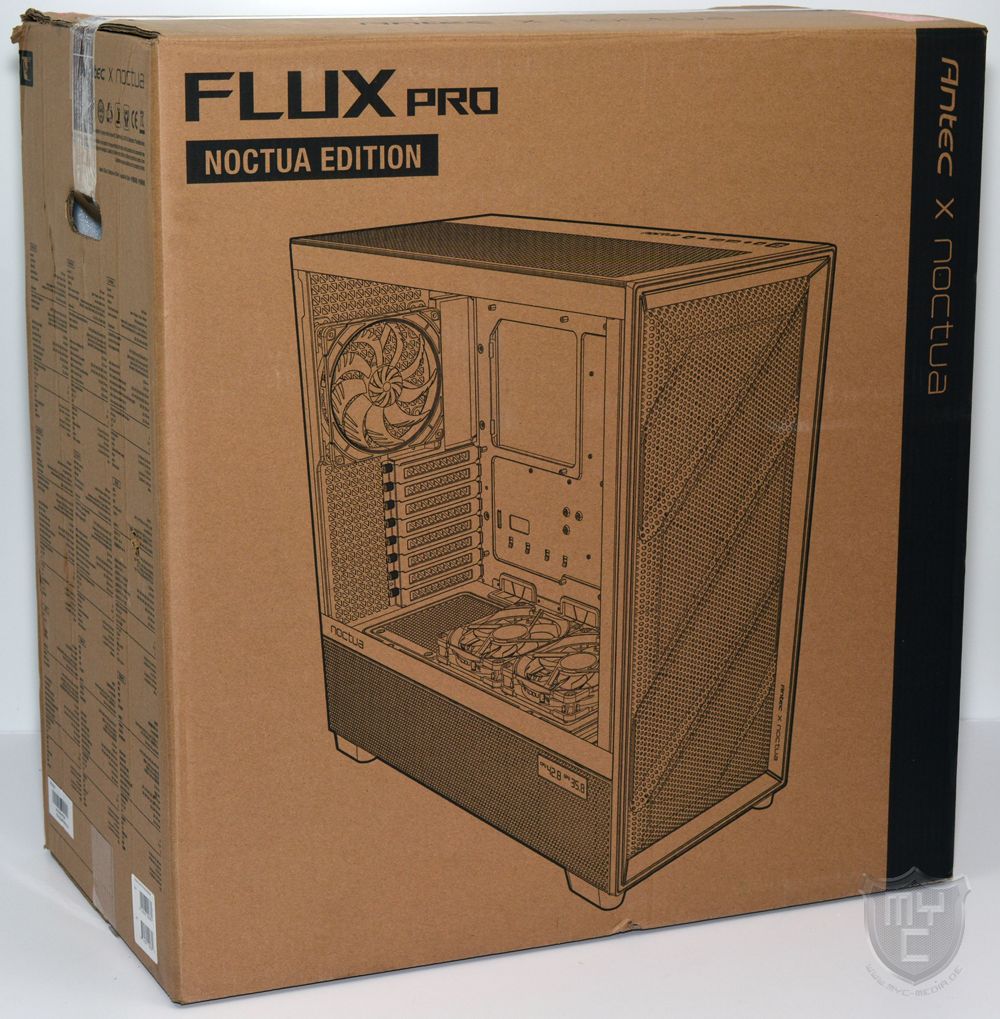 Das Flux Pro Noctua Edition E-ATX-Gehäuse wird von Antec in einer neutralen Verpackung geliefert, welche auf der Vorderseite neben der Modellbezeichnung auch mit einem skizzierten Produktbild bedruckt wurde.