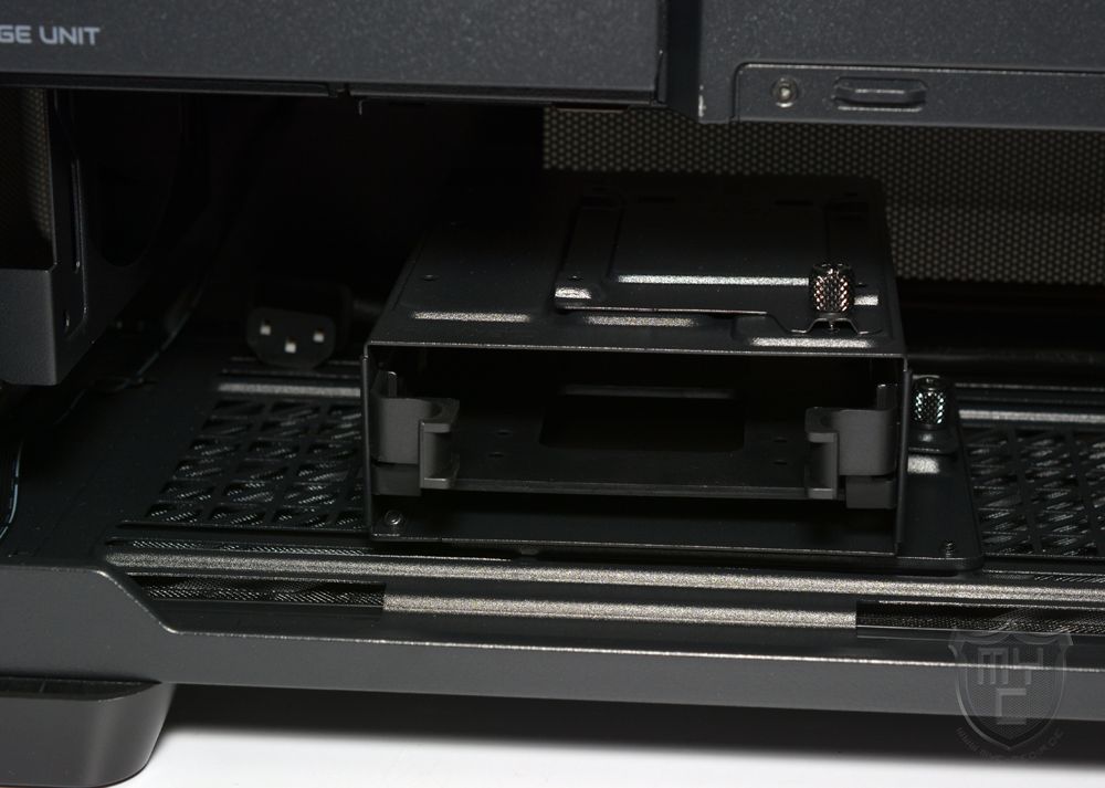 Mit einem Blick in den Netzteiltunnel findet man direkt hinter der Gehäusefront einen modularen Festplattenrahmen vor, in welchem man eine 2,5″- sowie eine 3,5″-Festplatte montieren kann.