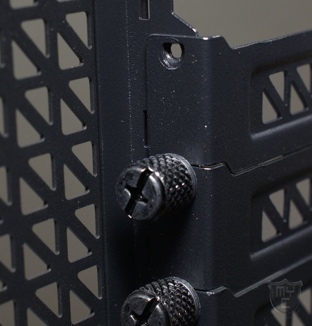 Die eingesetzten Erweiterungskarten dürfen bis zu 455 mm lang sein und können dank der eingesetzten Rändelschrauben zwar auch ohne Werkzeug montiert werden, jedoch sind die eingesetzten Rändelschrauben so dick ausgeführt, dass die gewünschte Slotblende nicht nur durch die eigentliche Schraube fixiert wird, sondern auch durch die Schraube der darunter befindlichen Slotblende.
