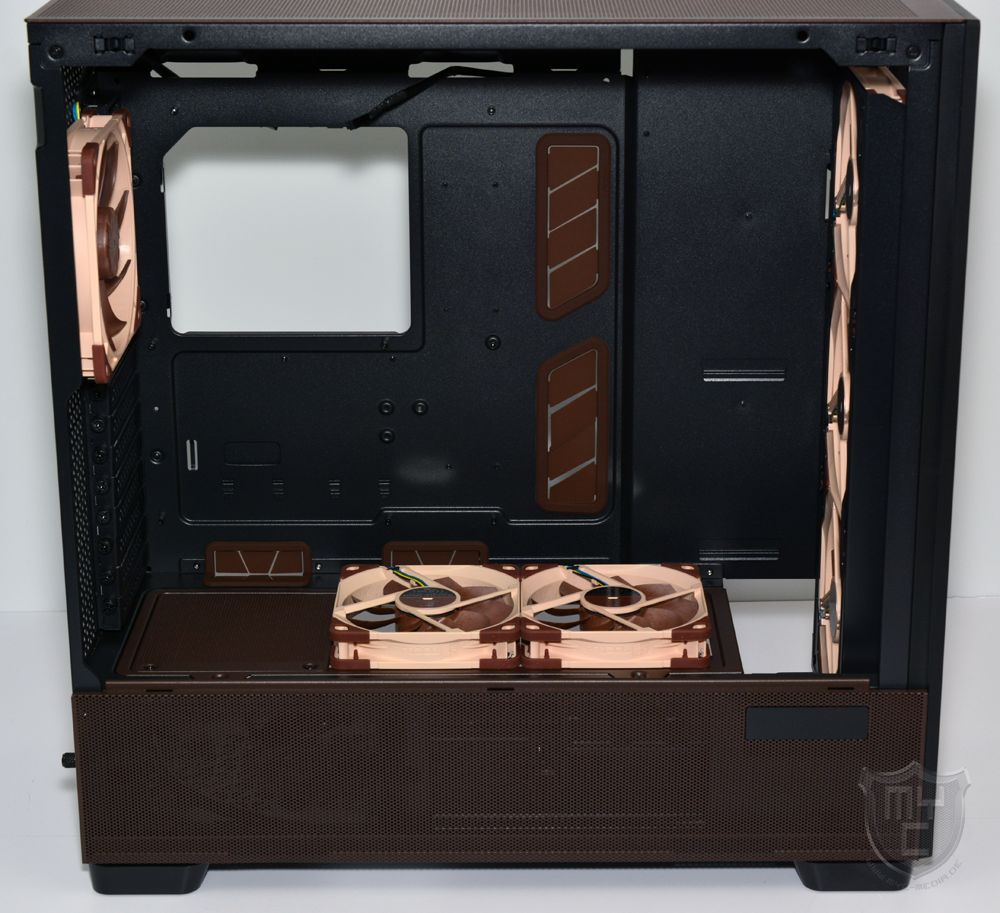 Werksseitig hat Antec die Oberseite des Netzteiltunnels dabei mit einer braunen Montageblende ausgestattet, welche die Montage von bis zu drei 120-mm-Lüftern ermöglicht. Passend zum Lieferumfang des Flux Pro Noctua Edition, welcher zwei NF-A12x25 G2 PWM beinhaltet, wurde einer der drei Montageplätze mit einem Mesh-Gitter verschlossen. Die beiden anderen Montageplätze lassen sich wahlweise mit den mitgelieferten Blenden verschließen, oder wie von Noctua empfohlen mit den beiden mitgelieferten NF-A12x25 G2 PWM bestücken.