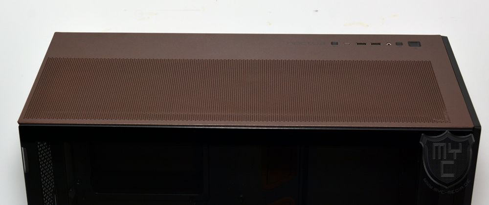 Neben dem I/O-Panel hat Antec die braun lackierte Gehäuseoberseite mit einem direkt in die Gehäuseoberseite eingeprägten Mesh-Gitter ausgestattet, welches zugleich als Staubfilter für den darunter befindlichen Luftauslass dient.