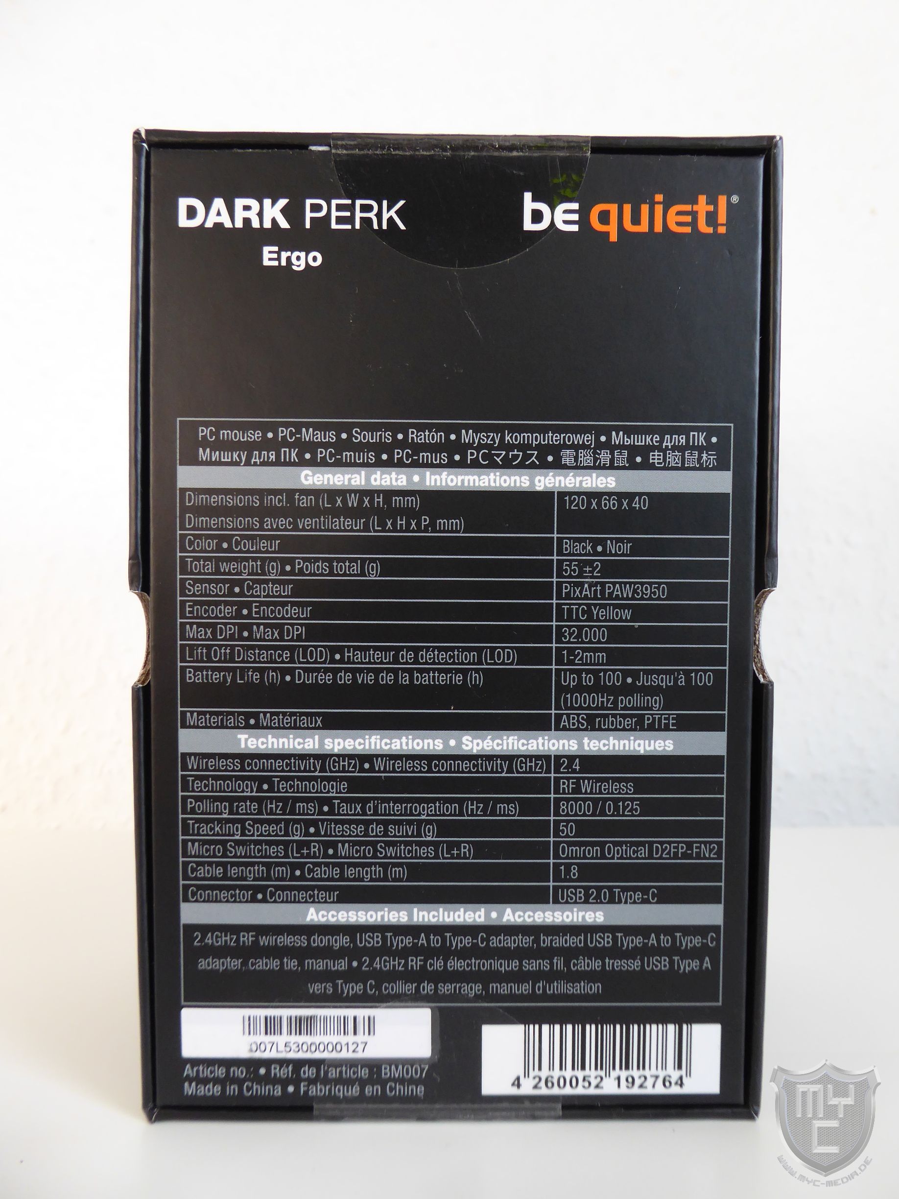 Die Dark Perk Ergo Gaming-Maus wird von be quiet! in einer Verpackung geliefert, welche in einem schwarzen Grunddesign gehalten ist. Auf der Verpackungsvorderseite wurden neben dem Hersteller-Logo auch die Modellbezeichnung sowie ein Produktbild abgedruckt.