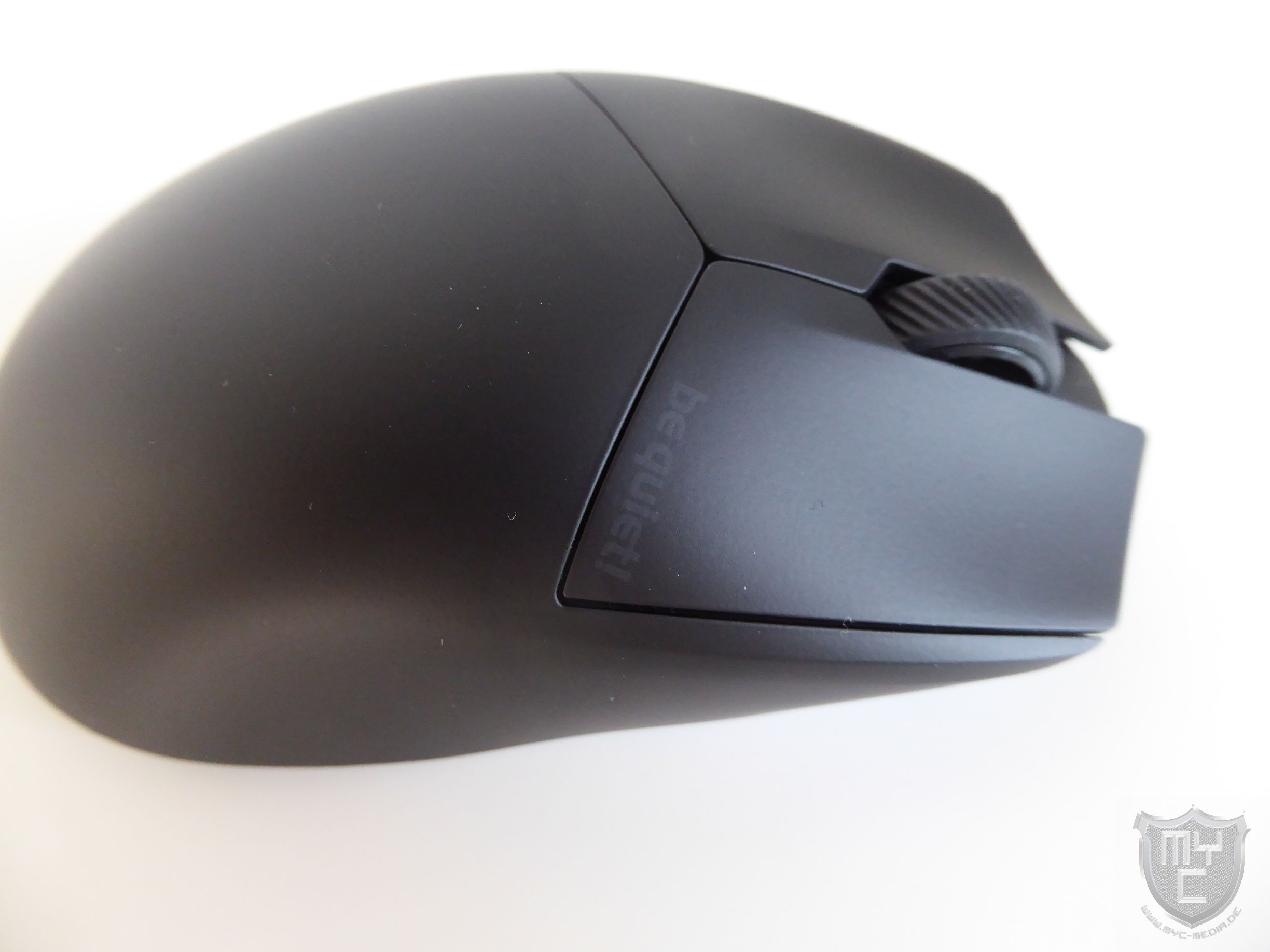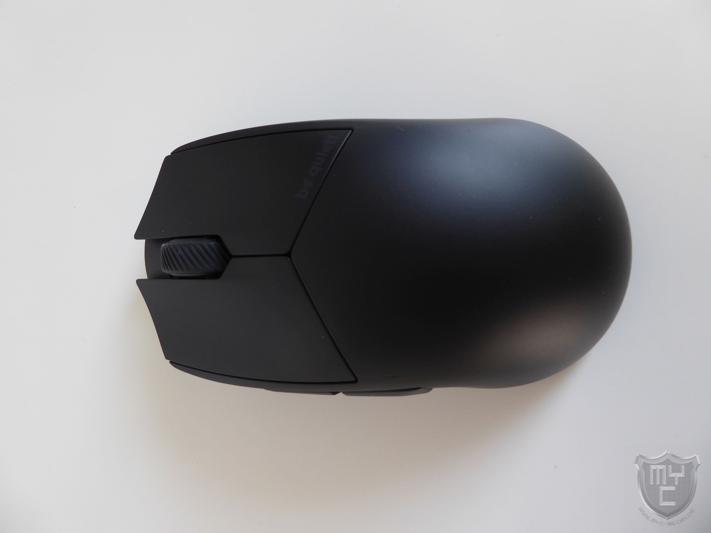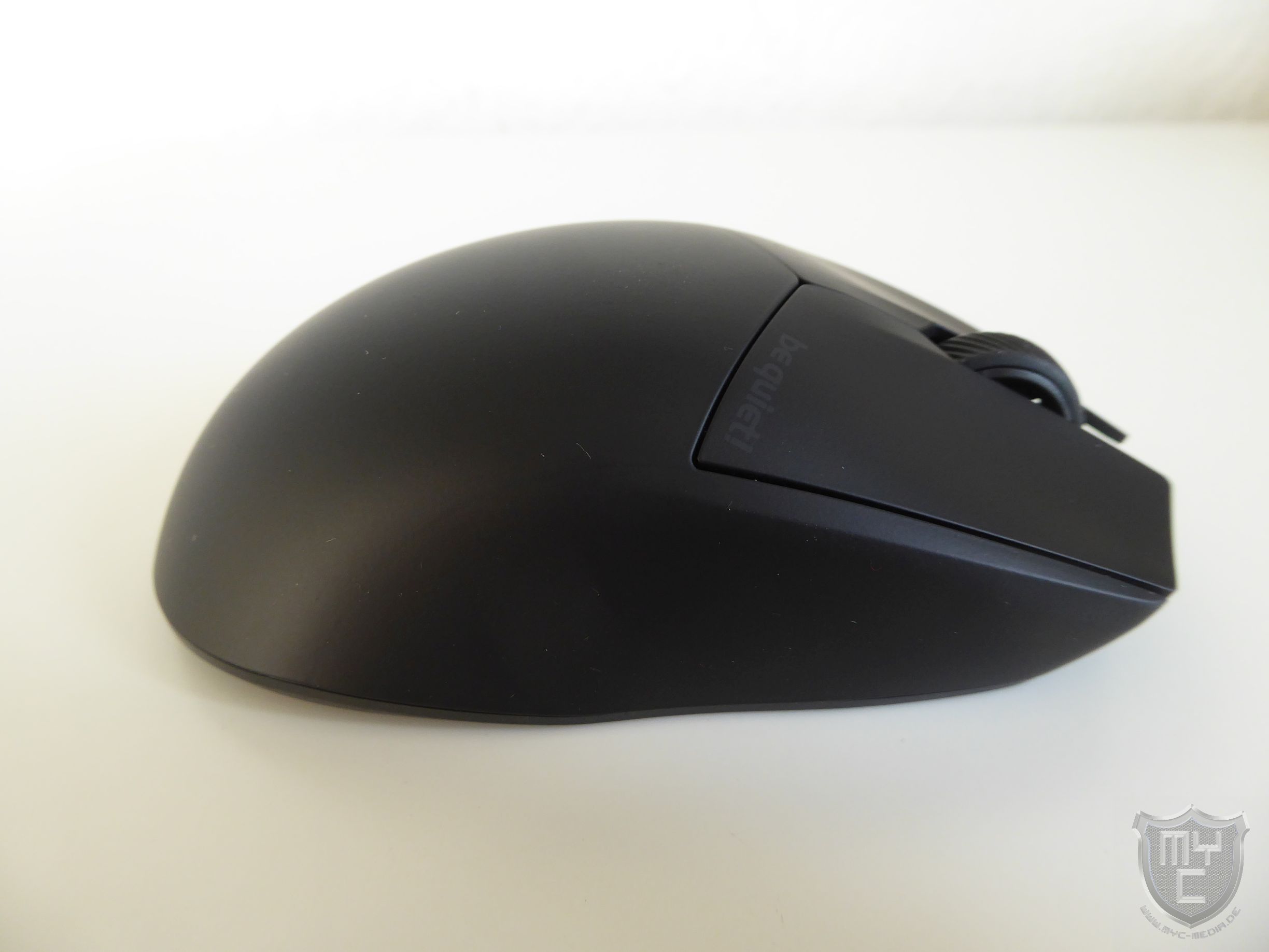 Auch von der rechten Seite der Maus ist die geschwungene und ergonomische Bauform deutlich zu erkennen. Auf der rechten Maustaste wurde zudem der be quiet! Schriftzug in einem dunklen grau abgedruckt.
