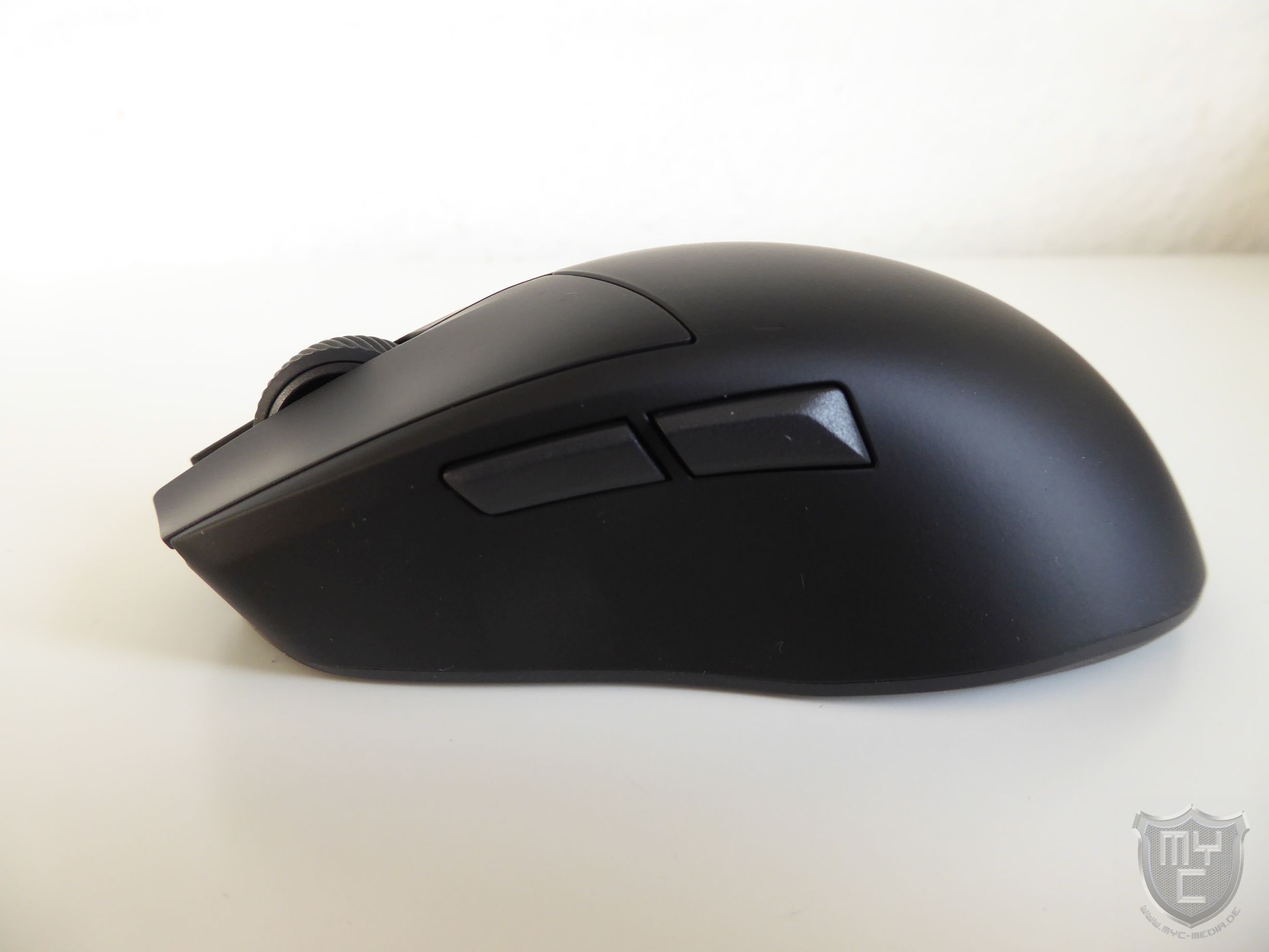 Betrachtet man die Maus einmal von der Seite aus, so kann man eine geschwungene und ergonomische Bauform erkennen.