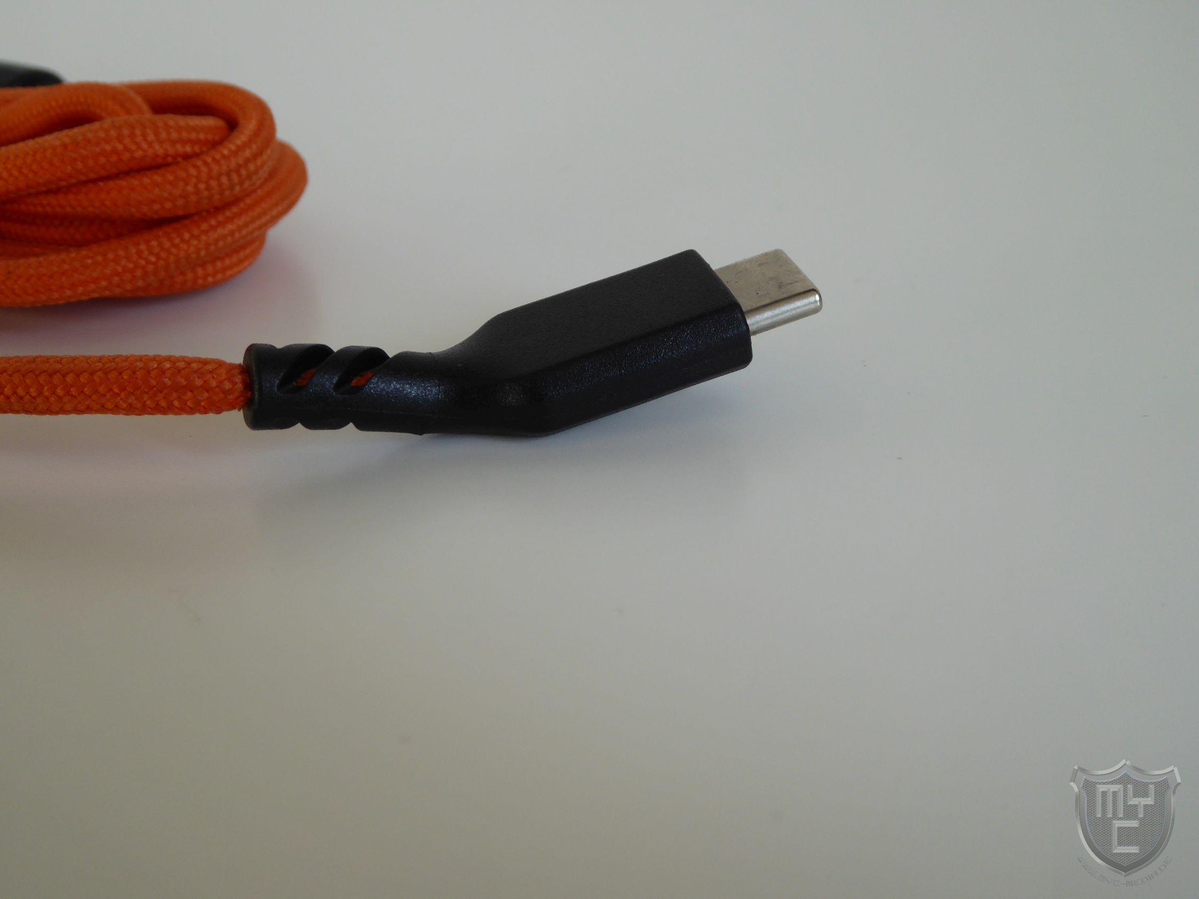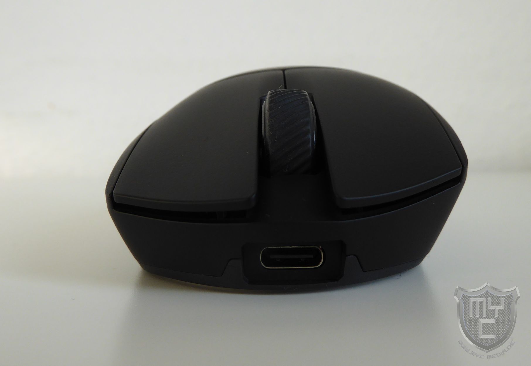 Betrachtet man die Maus einmal von der Vorderseite aus, so ist neben den zur Mausvorderseite hin schmaler werdenden sowie leicht gewölbten Maustasten auch eine vertieft eingelassene USB-C Buchse zu erkennen. Außerdem kann man erkennen, dass der ganze Körper der Maus insgesamt etwas auf die rechte Seite geneigt ist. Dies soll die Ergonomie weiter erhöhen.