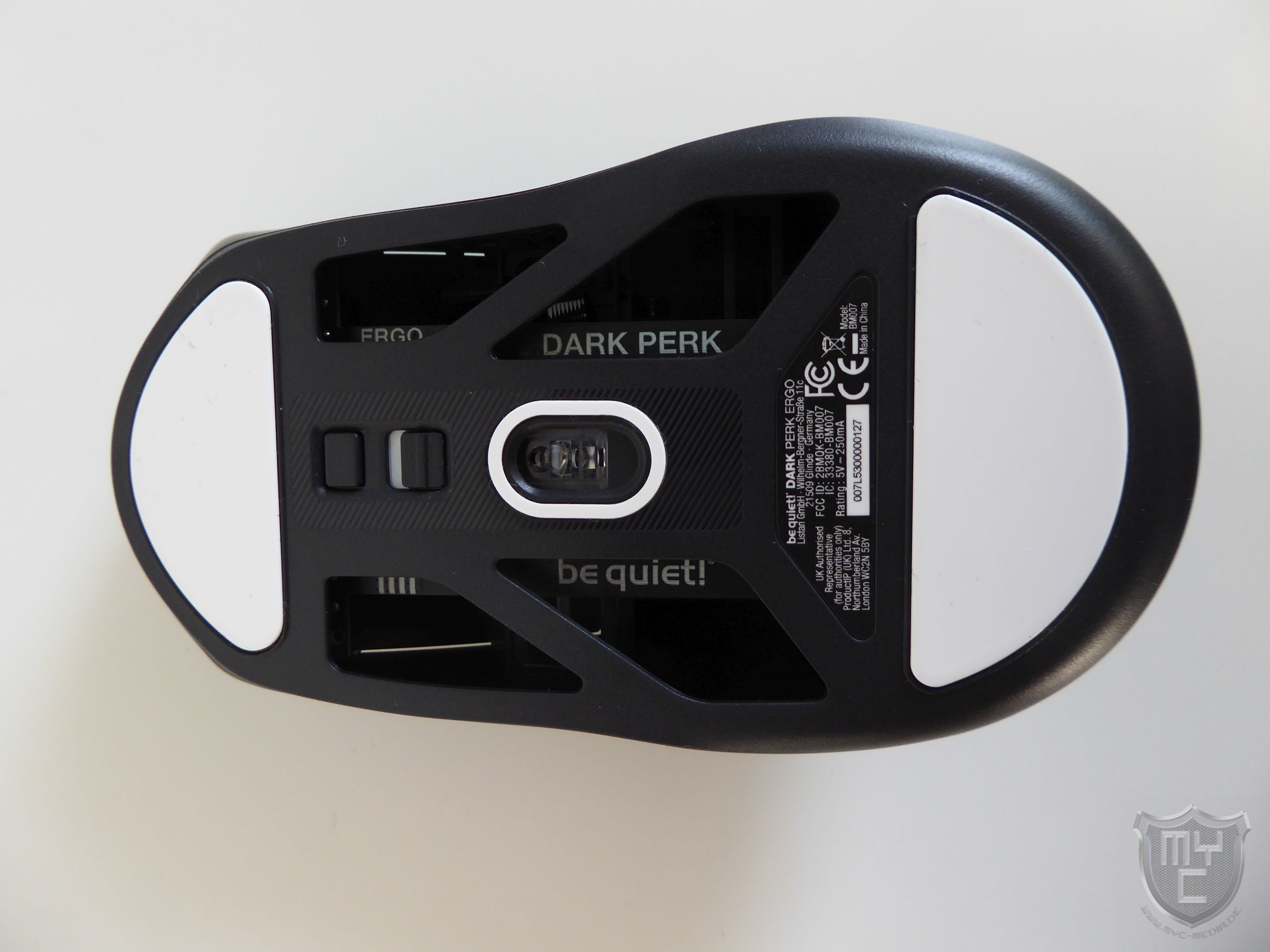 Der optische PixArt PAW3950 Sensor wurde in etwa mittig in der Maus verbaut. Vor dem Sensor hat be quiet! die Maus mit einem Taster sowie einen Schiebeschalter ausgestattet. Wo sich mittels des Tasters die Auflösung in insgesamt fünf Stufen umschalten lässt, kann die Maus mittels des Schiebeschalters zur Energieeinsparung im kabellosen Modus komplett ausgeschaltet werden. Kabelgebunden ist die Maus unabhängig von der Schalterstellung immer aktiv.