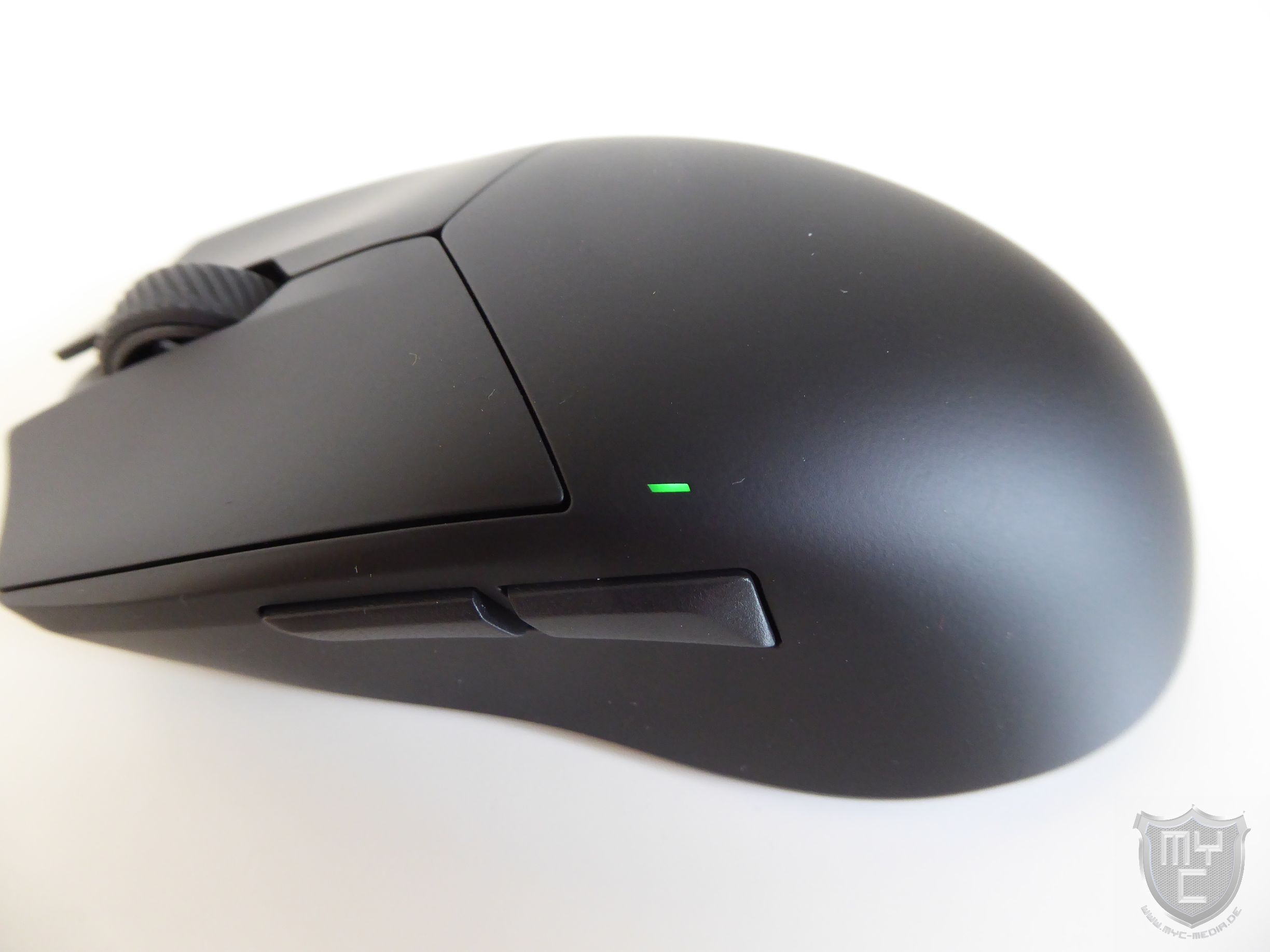 Auf der linken Seite der Maus ist eine Multi-Color-LED zur Statusanzeige angebracht. Mittels unterschiedlicher Beleuchtungsfarben wird über diese LED sowohl die ausgewählte Auflösung sowie Akkustand angezeigt.