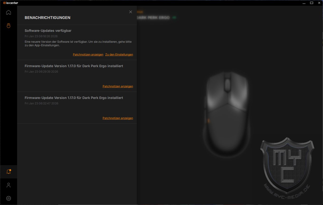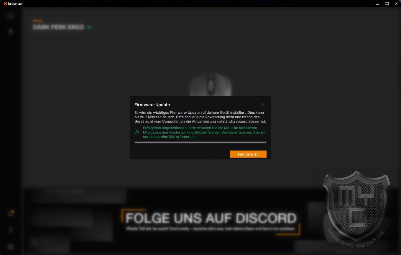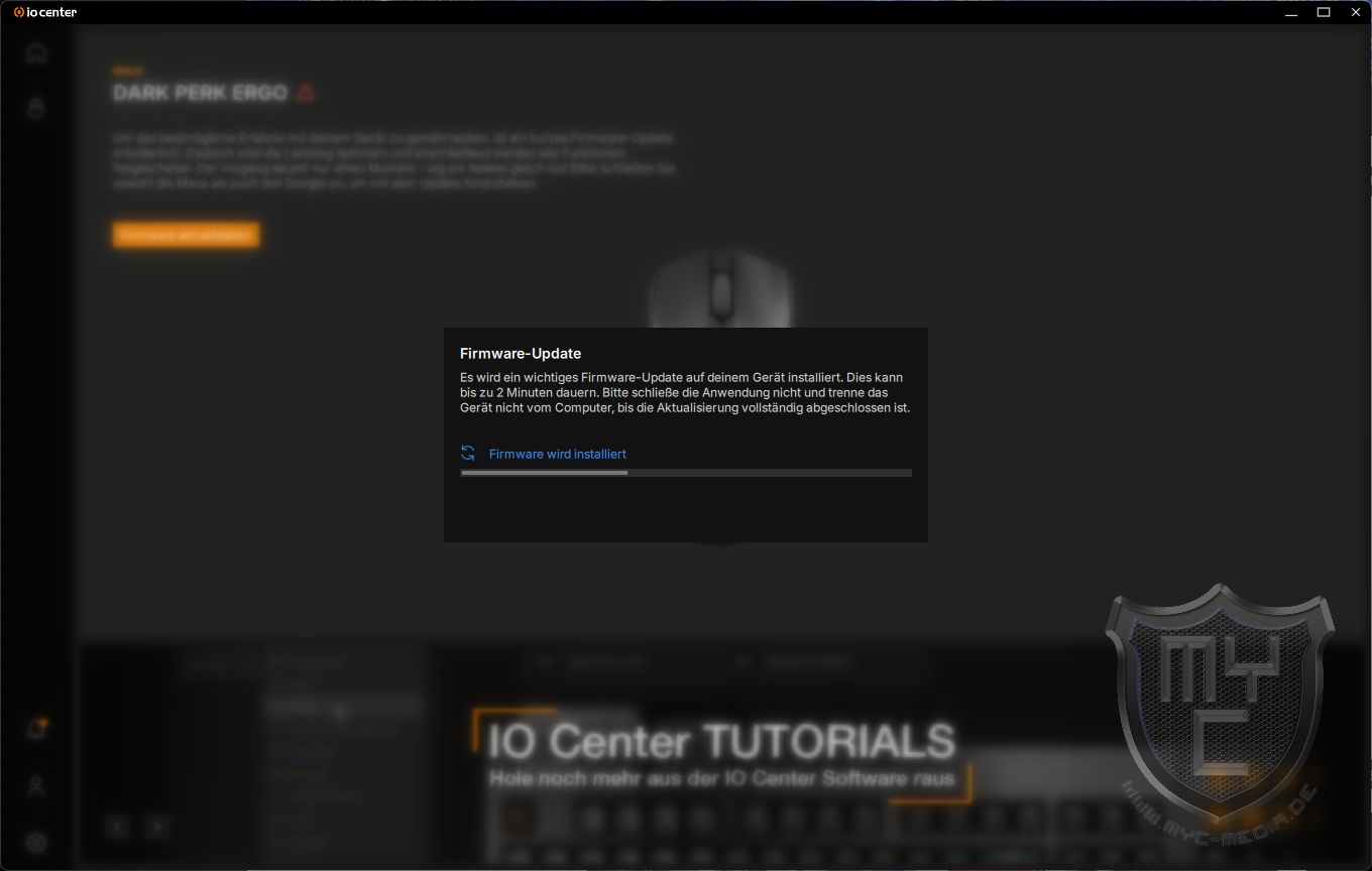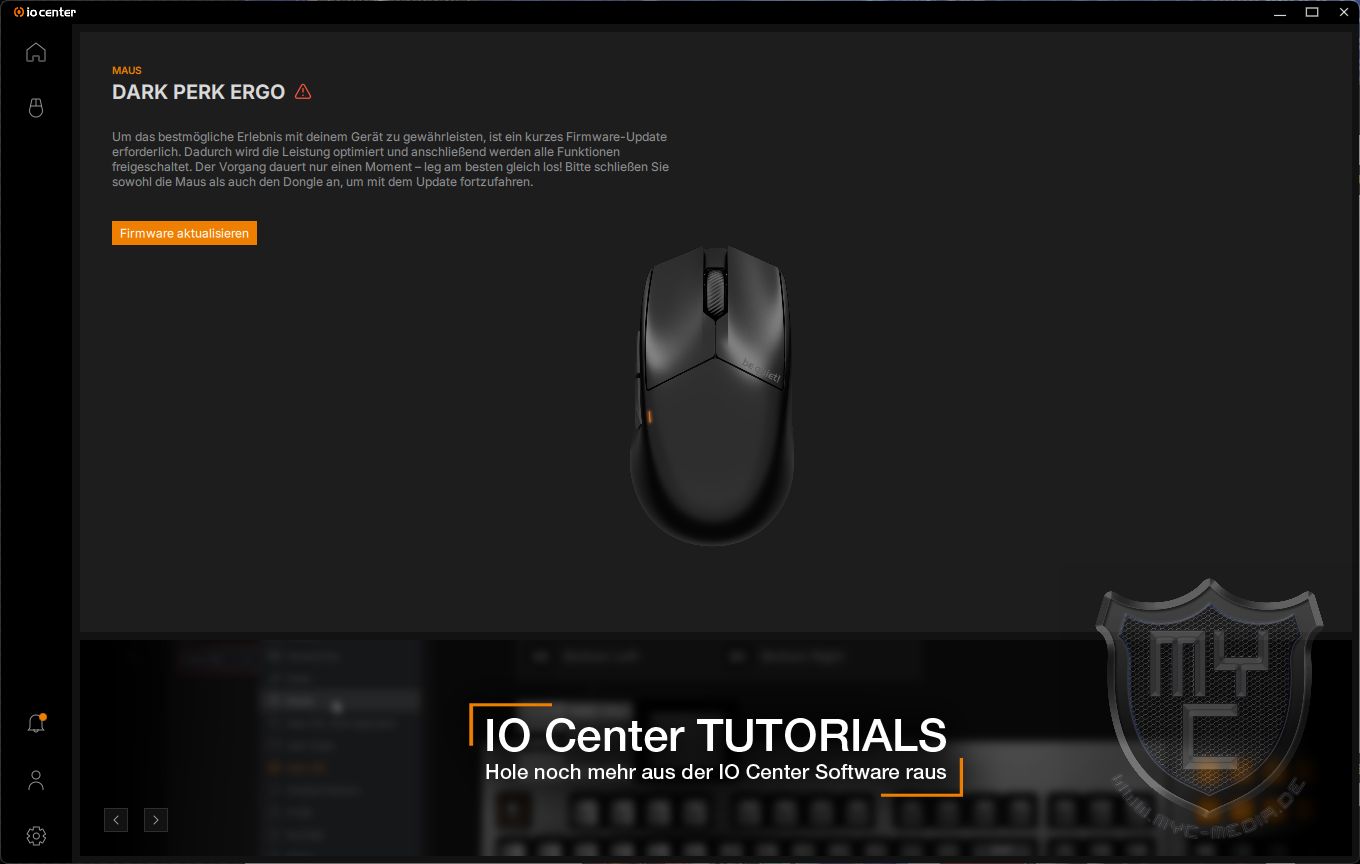 Unsere Testmuster der Dark Perk Ergo wurde sofort vom IO Center erkannt. Dieses weiß uns gleich nach dem Öffnen auf ein erforderliches Firmwareupdate hin. Für das Firmware Update mussten wir in der die Maus und USB-Dongle gleichzeitig an den PC anschließen und das Update anschließen starten.
