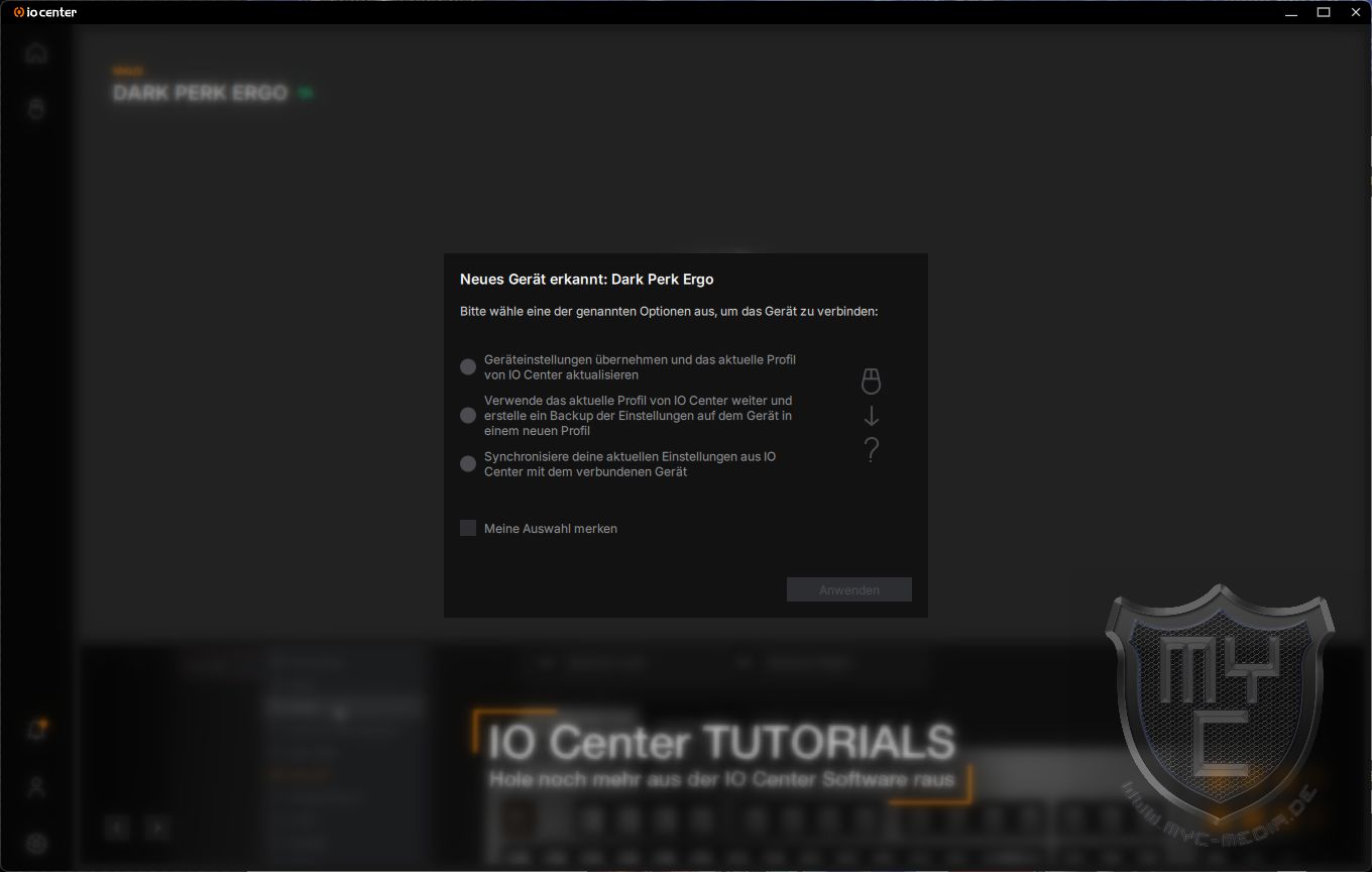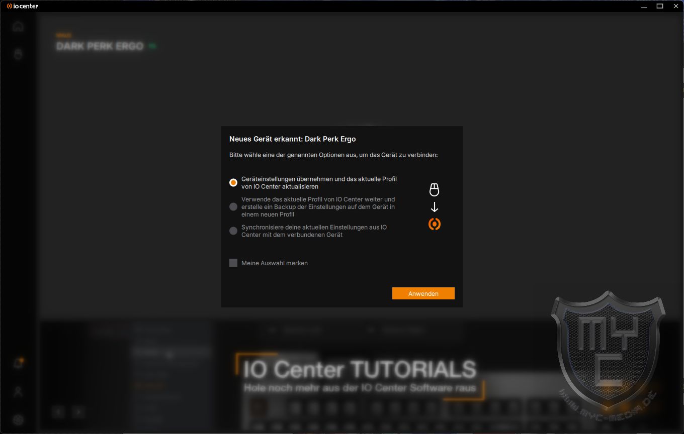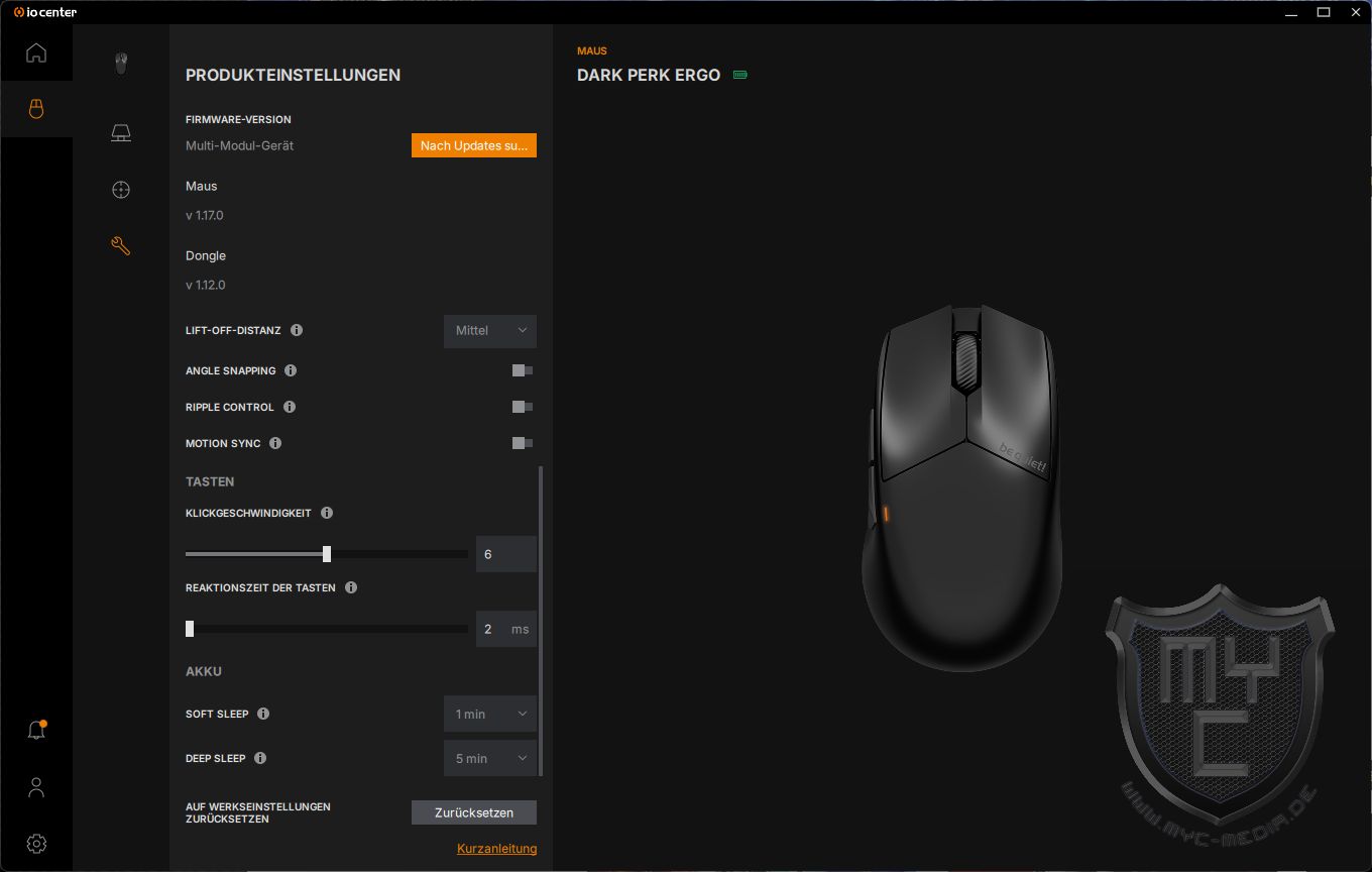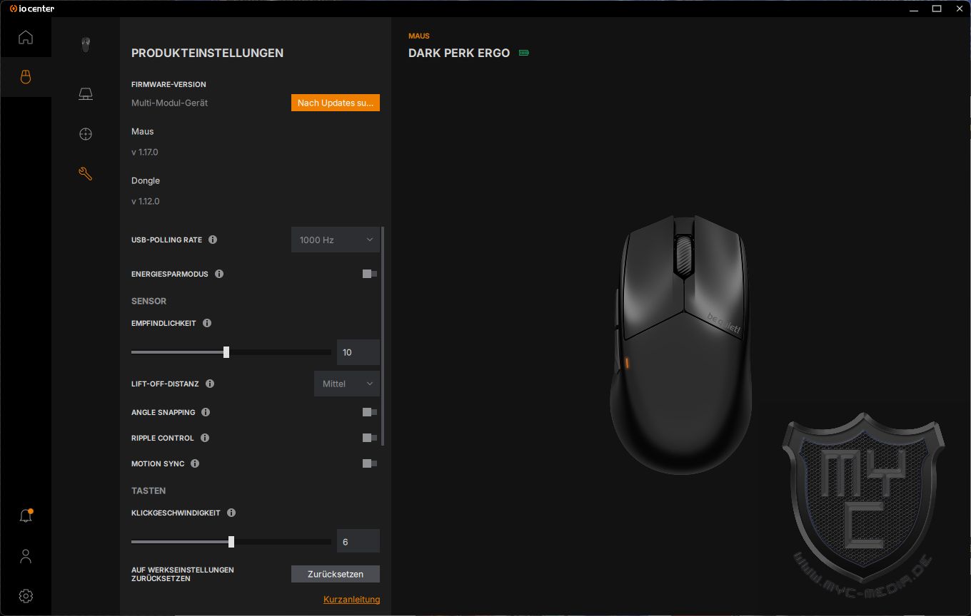 Unsere Testmuster der Dark Perk Ergo wurde sofort vom IO Center erkannt. Dieses weiß uns gleich nach dem Öffnen auf ein erforderliches Firmwareupdate hin. Für das Firmware Update mussten wir in der die Maus und USB-Dongle gleichzeitig an den PC anschließen und das Update anschließen starten.