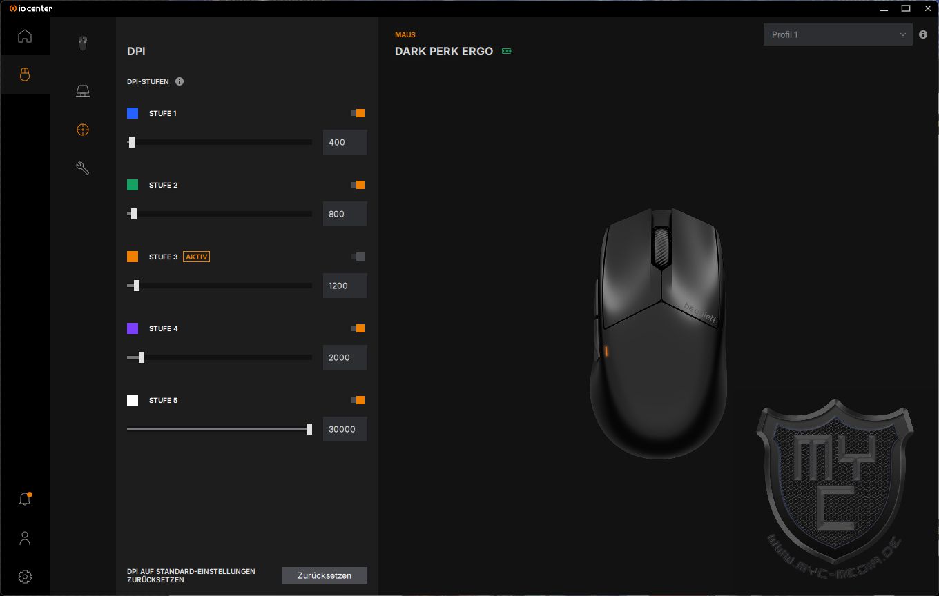 Alle verbauten Switche haben einen angenehmen und direkten Druckpunkt. Die Auflösung des optischen Sensors kann über die Software zwischen 100 und 32.000 DPI eingestellt und in 5 Stufen ausgewählt werden. Auf den von uns eingesetzten Stoff- und Kunststoff-Mauspads unterschiedlicher Hersteller erzielte der PixArt PAW3950 Sensor bei einer geringen sowie auch einer hohen Sensorauflösung ein gutes Ergebnis. Auch mit Aufdrucken auf dem Mauspad oder der Abtastung einer Holzoberfläche kam der Sensor ohne einen springenden Mauszeiger zurecht. Bei hohen DPI-Einstellungen konnten wir auf Stoff-Mauspads aus den Häusern Cherry, ASUS sowie Razer die präzisesten Ergebnisse erzielen. Die Lift-Off Distanz lässt sich in der Software in drei Stufen (niedrig bis hoch) anpassen. In Kombination mit einer maximalen Poling-Rate von 8.000 Hz eignet sich die Dark Perk Ergo wireless Gaming-Maus bestens für Einsätze, in denen besonders schnelle Reaktion und Bewegungen erforderlich sind. Durch diese Eigenschaften bietet einem die Dark Perk Ergo Wireless Gaming-Maus grundlegend alles, was man zum Spielen von schnellen FPS Titel benötigt.