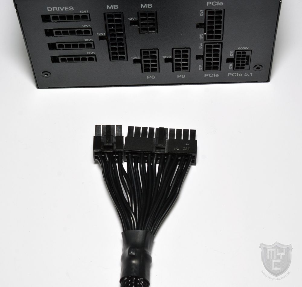 Bei unserem Testmuster, welches uns schon vor der offiziellen Veröffentlichung des Dark Power 14 erreicht hat, mussten wir bei der Konfektionierung des 24-PIN-ATX-Kabelstrangs feststellen, dass die beiden Kabelenden, welche am Netzteil angeschlossen werden so ausgeführt wurden, dass der kleinere Stecker des ATX-Kabelstrangs unter Zug steht und somit nicht gerade in seiner Buchse stecken bleibt.