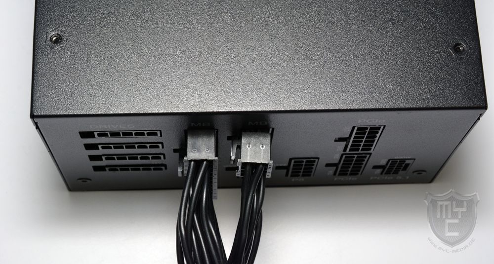 Neben vier Anschlüssen für die SATA- und Molex-Anschlüsse sowie zwei PCIe-Anschlüssen, über welche man vier 6+2-PIN-PCIe-Anschlüsse aus dem Netzteil herausführen kann, hat be quiet! an dieser Stelle auch noch zwei Anschlüsse für das 24-PIN-ATX-Kabel sowie zwei Anschlüsse die 4+4-Pin-EPS-Kabel verbaut.