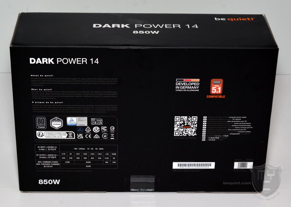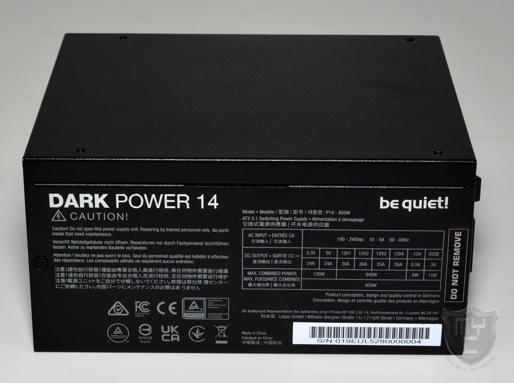 Auf der linken Netzteilseite wurde nicht nur ein silber glänzendes be quiet! und Dark Power 14 Logo angebracht, sondern auch eine Auflistung der wichtigsten Leistungsdaten aufgedruckt.