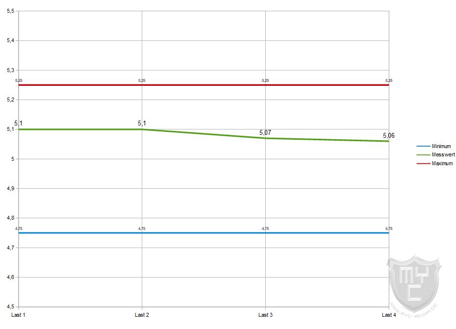 Schaut man sich auch die anderen Spannungen einmal genauer an, so ist zu erkennen, dass auch diese in allen Testabschnitten recht stabil geblieben sind. Dies gilt auch für die vierte Laststufe, in welcher wir das Netzteil zusätzlich mit sechs auf einen Schlag hinzugeschalteten Peltierelementen belastet haben.