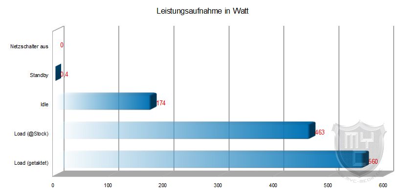 Das o. g. System inkl. Netzteil weist einen Strombedarf von etwa 170 Watt (IDLE) bis ca. 560 Watt (Volllast übertaktet) auf. Dieser kann jedoch je nach verwendetem Netzteil unterschiedlich sein. Unter Volllast wird besonders auf die Stabilität der Spannungen geachtet.