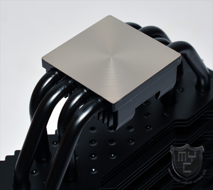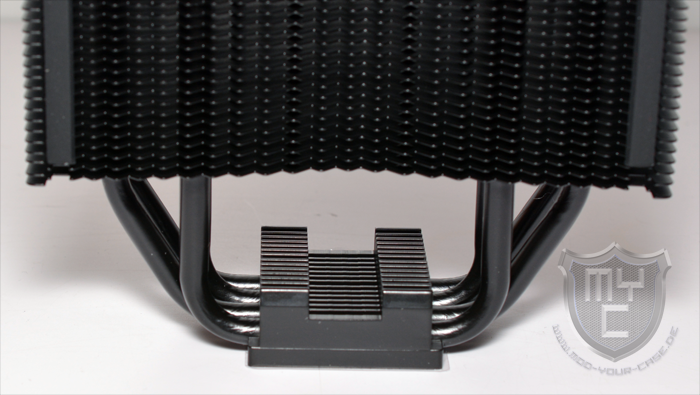Die vier Kupferheatpipes wurden passend zur schwarzen Ausführung des Kühlers ebenfalls mit einer schwarzen Keramikbeschichtung versehen und durchlaufen die Bodenplatte U-förmig gebogen.