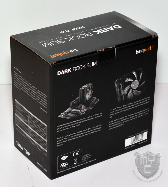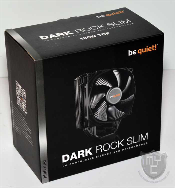 Der Dark Rock Slim wird von be quiet! in einer schwarzen Verpackung geliefert, deren Vorderseite neben einem Produktbild auch mit der Modellbezeichnung sowie einem Hinweis auf die hohe Kompatibilität bedruckt wurde.