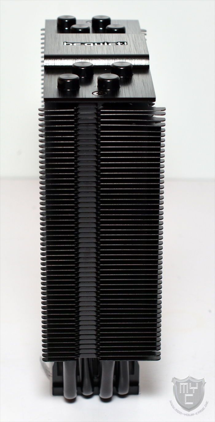 Betrachtet man den schlanken Lamellenblock einmal von einer der beiden Außenseiten aus, so kann man nicht nur eine in die einzelnen Lamellen eingelassene Vertiefung erkennen, welche zur Aufnahme der Lüfterklammern dienen, sondern auch, dass be quiet! im Vergleich zu vielen anderen Herstellern nicht auf einen asymmetrischen Aufbau setzt, sodass der Lamellenblock zentriert über der Bodenplatte angeordnet wurde.