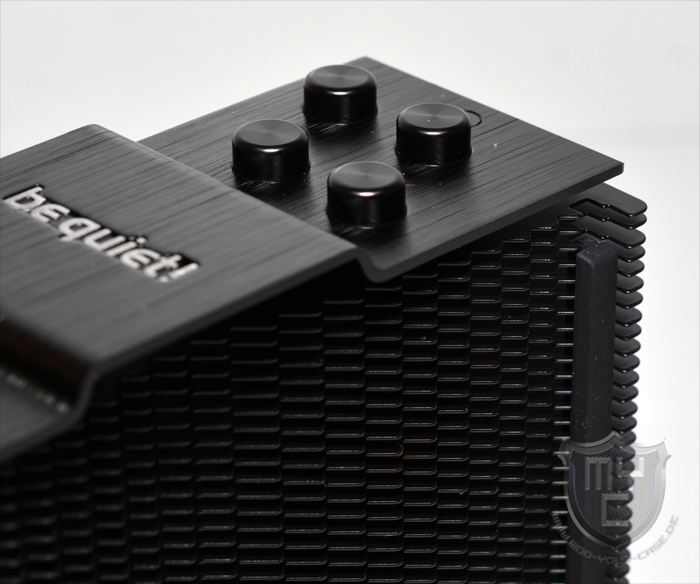 Nicht nur das Finnendesign kennen wir in sehr ähnlicher Form schon von den größeren Dark Rock Kühlern, sondern auch die Form und Ausführung der Abschlusslamelle. Diese ist in einem schwarz gebürsteten Aluminiumlook gehalten und wurde mittig mit einem eingelassenen be quit! Logo versehen.