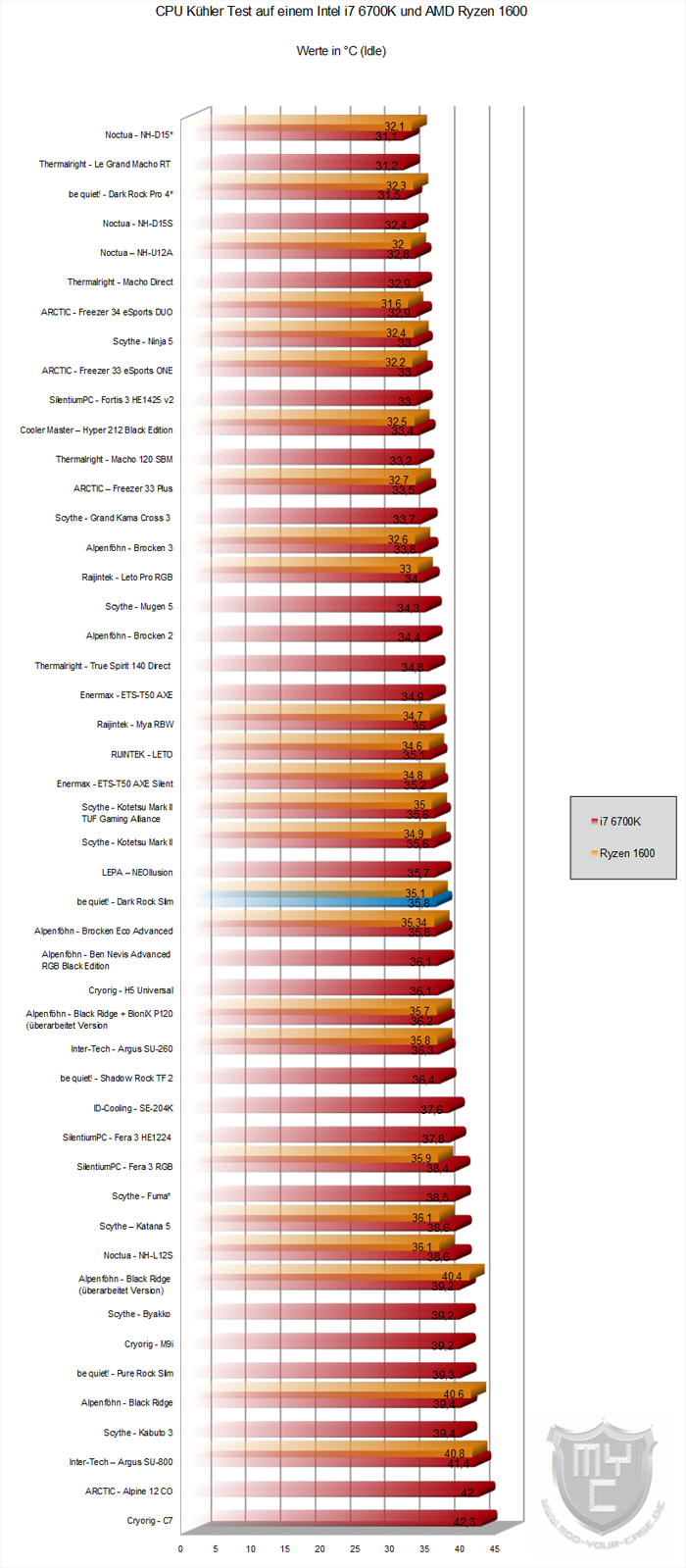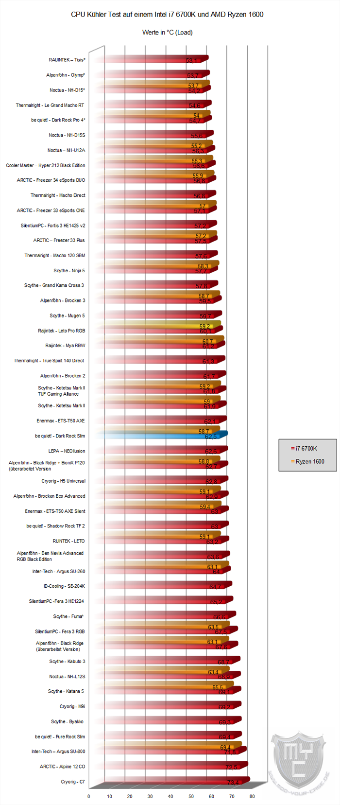 Schaut man sich das erreichte Testergebnis einmal etwas genauer an, so findet man den Dark Rock Slim mitten in unserem Testfeld wieder. Mit einem Blick auf die benachbarten Platzierung wird man schnell Kühler, welche mit mehr Heatpipes und 140-mm-Lüfter ausgestattet sind, finden, welche aber dennoch vom Dark Rock Slim geschlagen wurden.