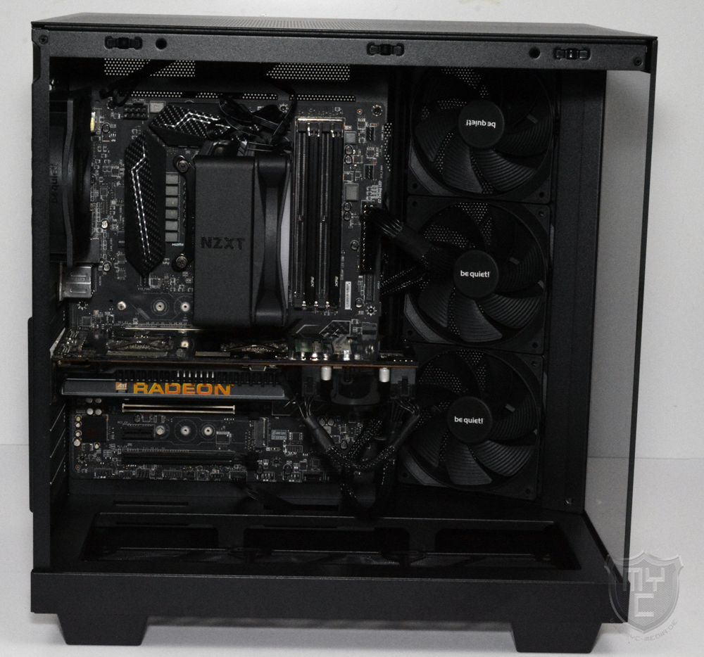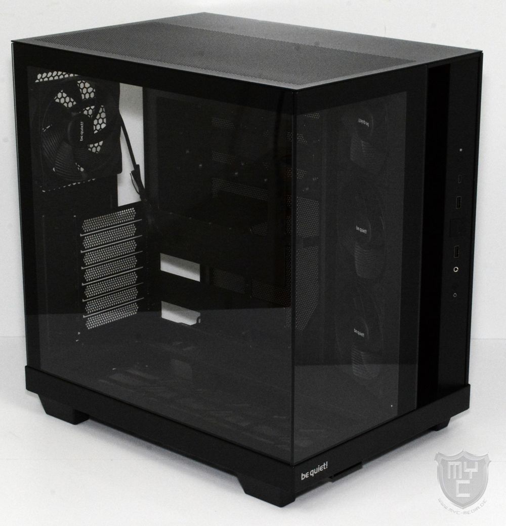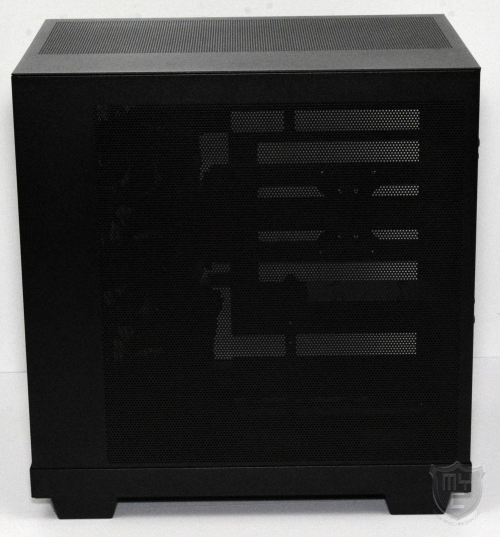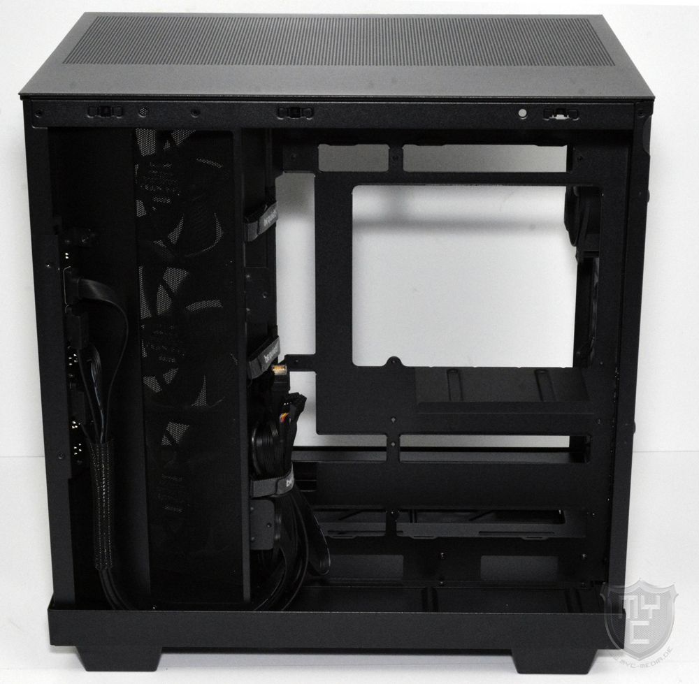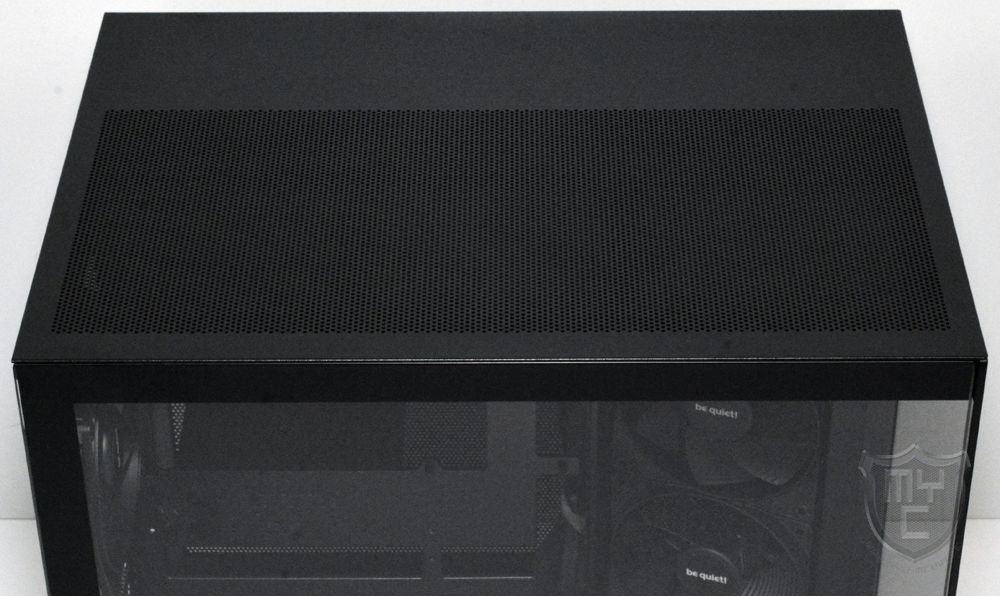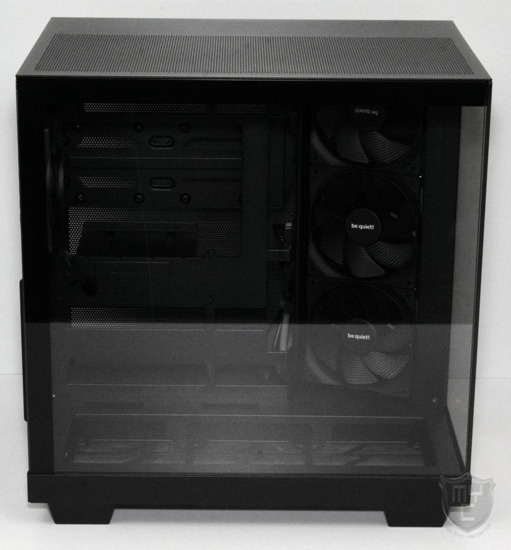 Auf der gegenüberliegenden Seite wurde eine Seitenwand aus schwarz lackiertem Stahlblech verbaut, welche wie auch die Gehäuseoberseite mit einem großflächigen, jedoch feinen Mesh-Gitter versehen wurde. Auf einen Staubfilter hat be quiet! jedoch auch in dieser Stelle leider verzichtet.