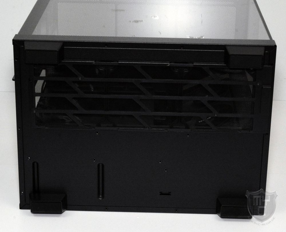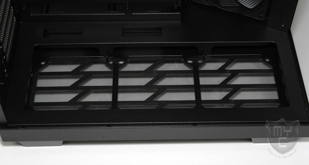 Mit einem Blick auf die Gehäuseunterseite findet man einen Lufteinlass vor, welcher die Montage von bis zu drei 120-mm-Lüfter ermöglicht und wie der Lufteinlass an der Gehäusevorderseite mit einem feinen Staubfilter ausgestattet wurde.