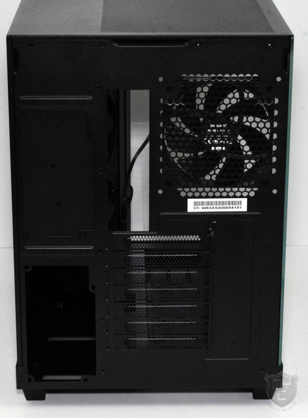 In der benachbarten Klimazone ist im oberen Bereich der Ausschnitt für das I/O-Shield zu finden, neben welchem be quiet! einen weiteren Luftauslass in das Gehäuse eingearbeitet, an welchem ein weiterer Pure Wings 3 Lüfter vormontiert wurde.