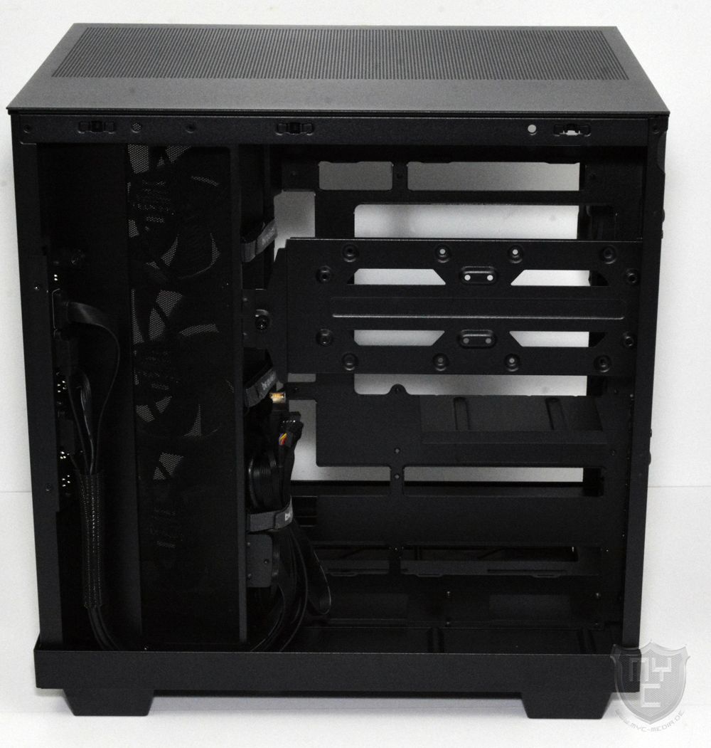 Dieser invertierte Lüfteraufbau sorgt dafür, dass die Richtung, in welche die von den Lüftern geförderte Luft bewegt wird, ohne Einfluss auf die Optik durch die abgeschrägte Gehäusefront ins Gehäuseinnere erfolgen kann.