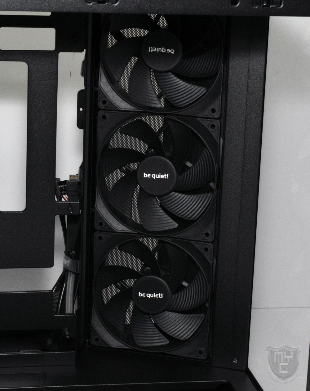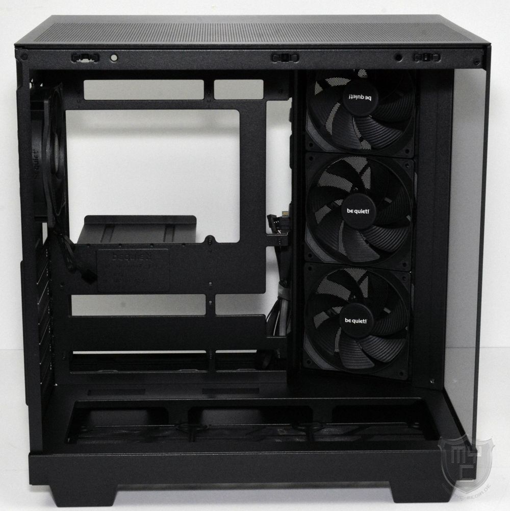 Den verlängerten Bereich des Mainboardschlittens hat be quiet! mit einer Lüfterblende ausgestattet, an welcher die zuvor schon angesprochenen 120 mm Pure Wings 3 Reverse Lüfter vormontiert wurden.