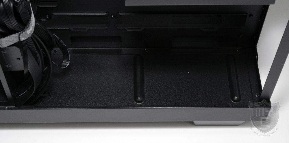 Durch das getrennte Zweikammerdesign des Light Base 500 sucht man zudem den sonst häufig am Gehäuseboden zu findenden Netzteiltunnel vergeblich. Anstelle des Netzteiltunnels blickt man am Gehäuseboden als Erstes auf den etwas vertieft eingelassenen Lufteinlass, welcher eine mit dem Gehäuseboden bündige Lüftermontage ermöglicht.
