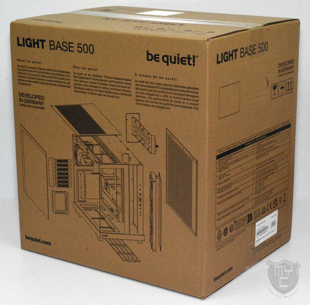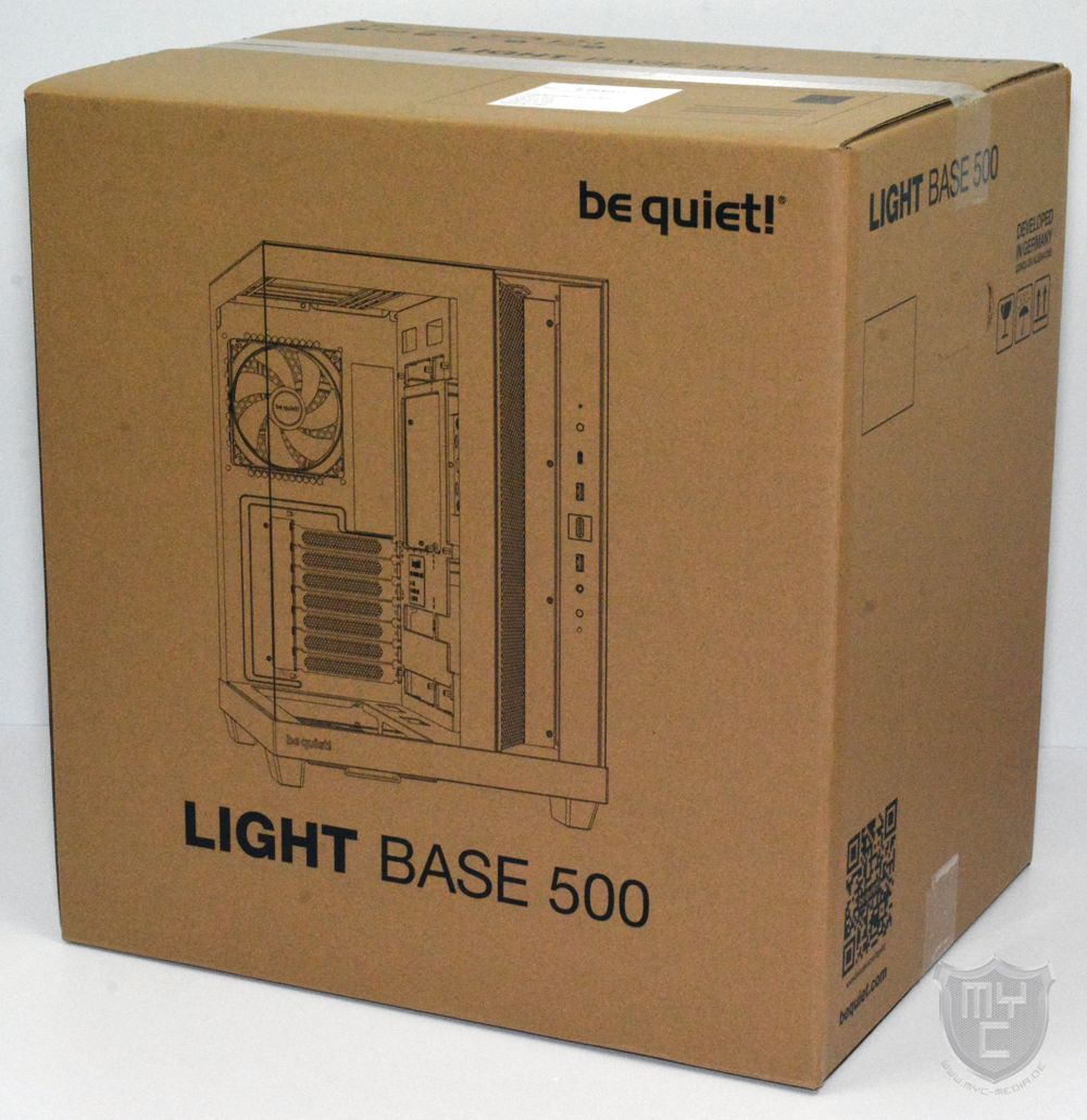Wie wir es in der Zwischenzeit schon von anderen Gehäusemodellen aus dem be quiet! Sortiment kennen, kommt auch das be quiet! Light Base 500 Gehäuse in einer neutralen Verpackung beim Käufer an, welche auf der Vorderseite neben der Modellbezeichnung auch mit einer Skizze des enthaltenen Gehäuses bedruckt wurde.