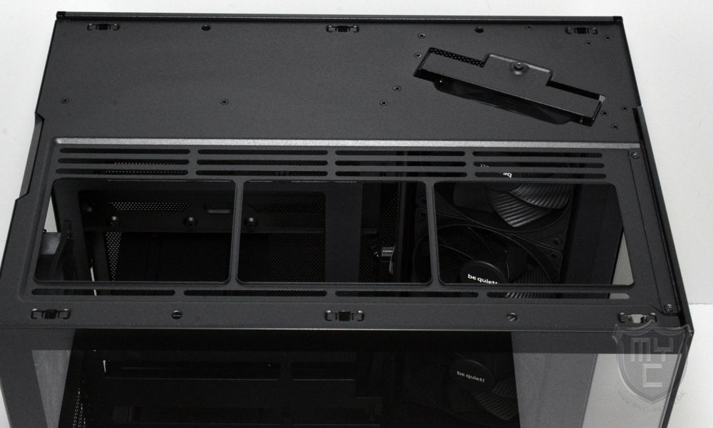 Unterhalb des abnehmbaren Gehäusedeckels kann man bis zu drei 120-mm-Lüfter bzw. zwei 140-mm-Lüfter verbauen. Auch die Montage eines bis zu 360 mm großen Radiators ist an dieser Stelle möglich.