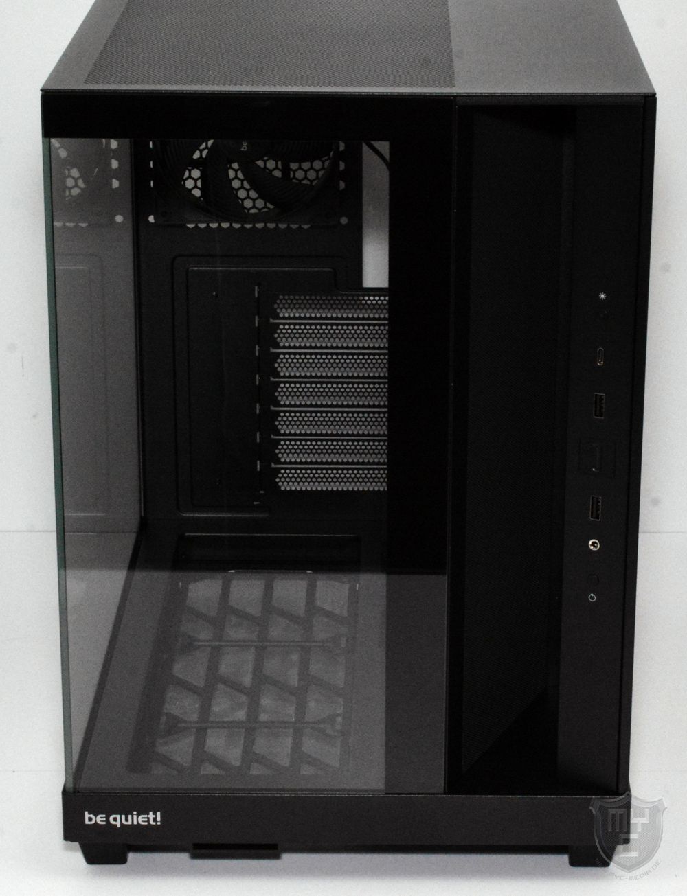 Der hinter dem I/O-Panel abgeschrägte Bereich der Gehäusefront dient als Lufteinlass und wurde hierzu mit einem sehr feinen und herausnehmbaren Mesh-Gitter ausgestattet, hinter welchem be quiet! schon drei Pure Wings 3 Reverse Lüfter vorinstalliert hat.