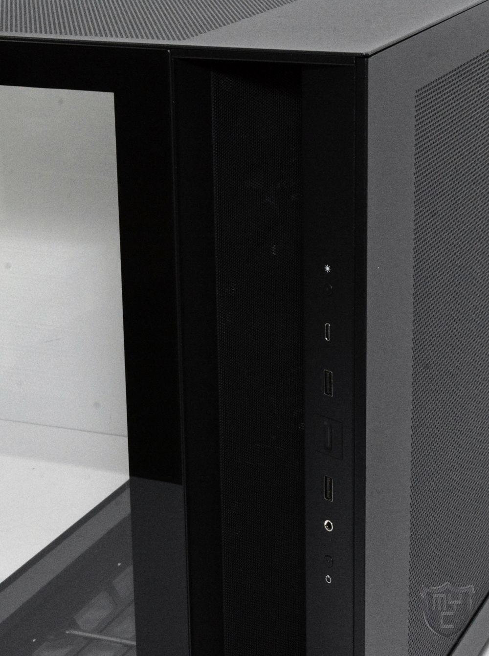Neben dem obligatorischen Power- und Resetschalter wurden an dieser Stelle auch zwei USB 3.0 Anschlüsse sowie zwei USB 3.1 Type C Anschlüsse verbaut. Zudem findet man hier auch noch eine vierpolige 3,5-mm-Klinkebuchse sowie einen Schalter zur Steuerung eines optionalen RGB-Controllers vor.