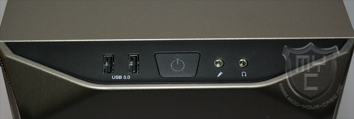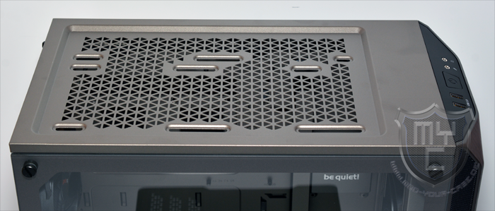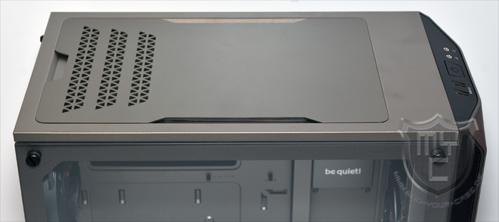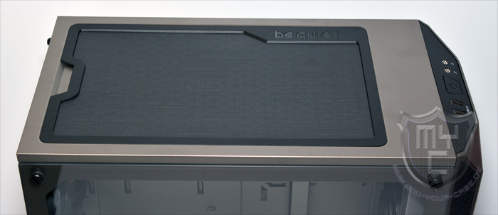 An der Ober- und Unterseite wurde die Gehäusefront mit einem abgeschrägten Bereich versehen, wodurch ein angenehmer Übergang zum Gehäuseboden und dem Gehäusedeckel geschaffen wurde. In die obere Kante der Gehäusefront wurde das I/O-Panel eingearbeitet. Um das Design der beiden seitlichen Lufteinlässe aufzugreifen hat be quiet! dieses in ein schwarzes Kunststoffelement eingefasst. Neben den obligatorischen Audioanschlüssen wurde das I/O-Panel auch mit zwei USB 3.0 Anschlüssen ausgestattet.