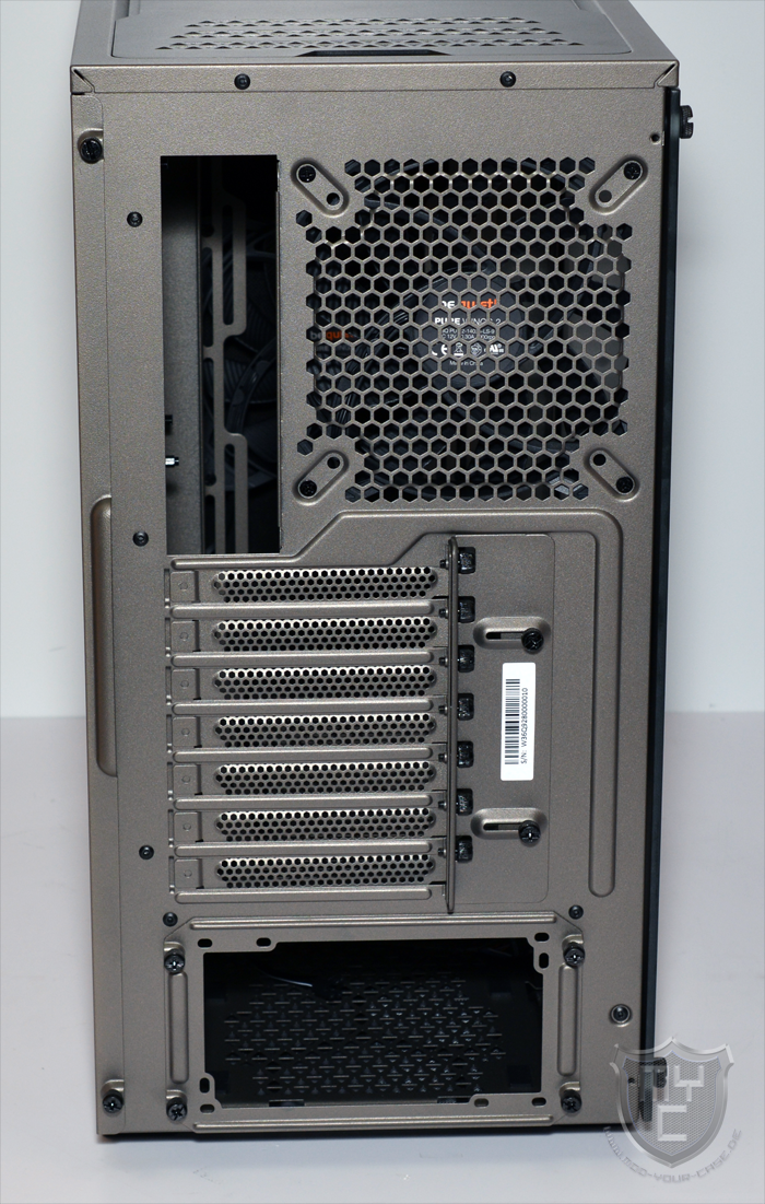 Mit einem Blick auf die Gehäuserückseite findet man neben dem Ausschnitt für das I/O-Shield einen weiteren Luftauslass vor. Der ebenfalls im Dreiecksdesign gehaltene Luftauslass wurde werksseitig schon mit einem Pure Wings 2 140-mm-Lüfter ausgestattet.