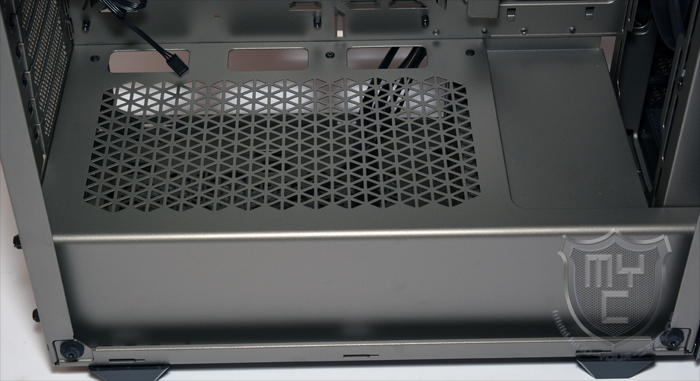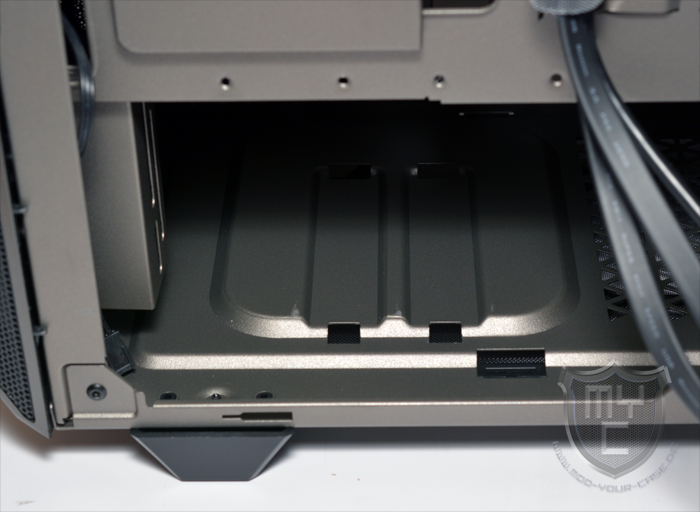Im hinteren Bereich des PSU-Tunnels befindet sich der Einbauplatz für ein ATX-Netzteil. Der Gehäuseboden wurde an dieser Stelle mit Gummientkopplern ausgestattet und ermöglicht somit eine vom Gehäuseboden entkoppelte Netzteilmontage.