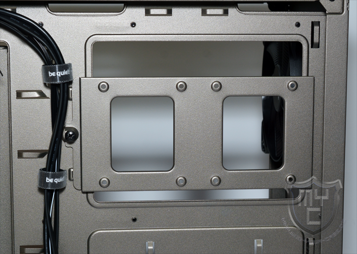 An der großen Aussparung, welche zur Kühlermontage bei einem schon montierten Mainboard dient, wurde eine Blende angebracht, an welcher man zwei weitere 2,5“-Festplatten montieren kann.
