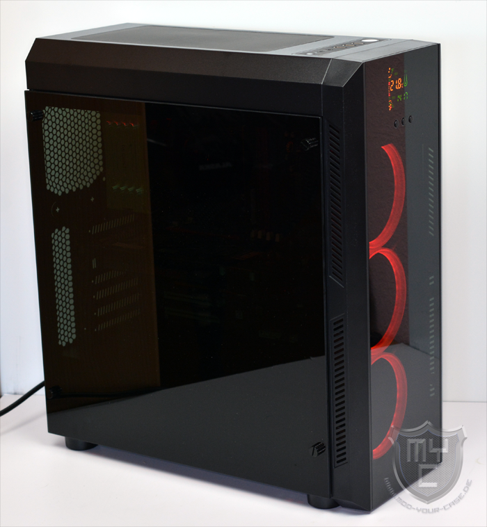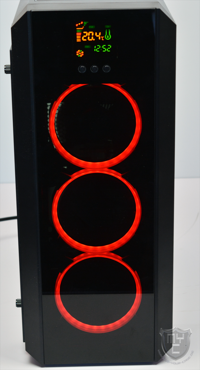Wo die Lüfter auf der zur Gehäuseinnenseite hingerichteten Seite über einen schwarzen Lüfterrahmen verfügen, wurde der Lüfterrahmen auf der gegenüberliegenden Seite mit einem leicht transparenten Aufbau versehen. Durch diesen Aufbau ist eine Beleuchtung der Lüfter möglich, welche durch die gläserne Gehäusefront für einen schicken Effekt sorgt.