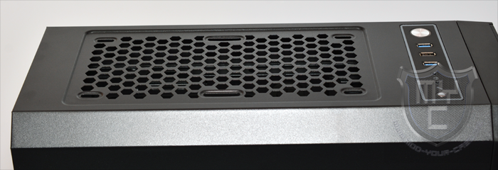 Unterhalb des aufgesetzten Staubfilter wurde ein großmaschiges Wabengitter in den Gehäusedecken eingelassen, hinter welchem man zwei 120-mm-Lüfter verbauen kann.