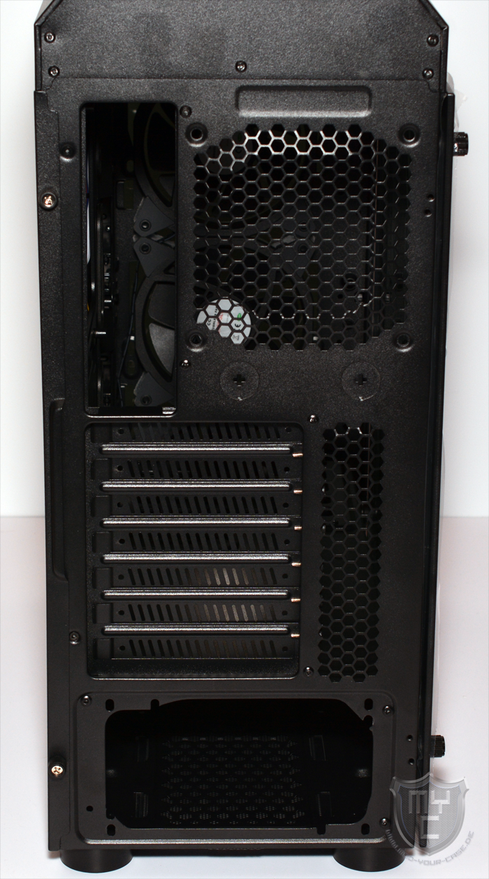 Mit einem Blick auf die Gehäuserückseite findet man im oberen Bereich neben dem Ausschnitt für das I/O-Shield einen Luftauslass vor, welcher in Form eines Wabengitters realisiert wurde. Wie wir es von dem Luftauslass an der Gehäuseoberseite kennen, kann auch an dieser Stelle ein 120-mm-Lüfter verbaut werden. Unterhalb dieses Luftauslasses hat Chieftec zwei vorgestanzte Schlauchdurchführungen eingearbeitet. Im weiteren Verlauf sind sieben geschlitzte Slotblenden zu finden.