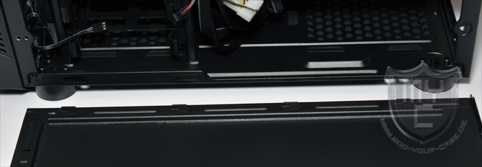 Im direkten Vergleich zu vielen anderen Gehäusen, welche über einen solchen Aufbau verfügen, hat Chieftec den eingesetzten Netzteiltunnel nicht mit einem komplett geschlossenen Aufbau versehen, sondern man hat dessen Oberseite im vorderen Drittel mit quadratischen Aussparungen versehen. Durch diesen Aufbau kann ein gewisser Luftaustausch zwischen den beiden Klimazonen erfolgen. Hinter diesen Aussparungen wurde zudem eine gummierte Kabeldurchführung eingearbeitet.