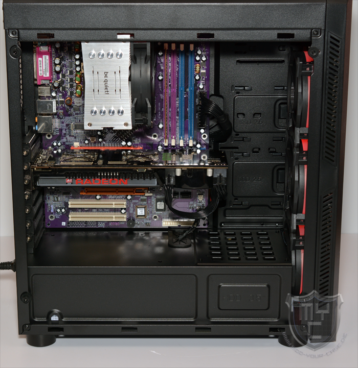 Auch wenn man durch die verbauten Echtglasseitenscheiben schon einen kleinen Blick in das Gehäuseinnere werfen kann, kann man alle Details erst dann erkennen, wenn man die beiden Seitenwände vom Gehäuse abnimmt.